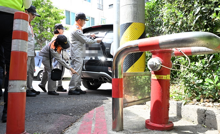 제주 전역에 소화전 주변 불법 주·정차 차량에 대한 집중 단속이 이뤄진 27일 제주시 연동의 한 주택가에서 단속반이 소화전 주변 위반 사항을 확인하고 있다. 강희만기자.