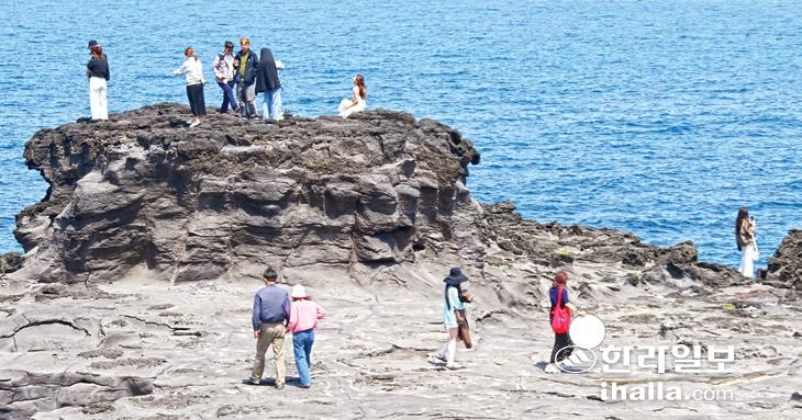 [한라일보] 27일 제주시 애월읍 구엄리 해안을 찾은 관광객들이 사진을 찍으며 제주의 봄바다를 즐기고 있다.