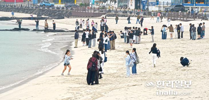 [한라일보] 제주시 구좌읍 월정해수욕장을 찾은 수학여행단 학생들이 봄바다의 정취를 즐기고 있다.