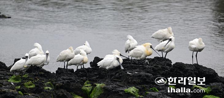 [한라일보] 28일 번식지로 이동하던 저어새들이 중간 기착지인 서귀포시 성산읍 시흥리 해안에서 휴식하고 있다.