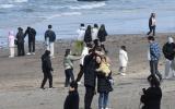 맨발로 해변 걷는 시민들