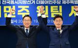 [한라일보] 더불어민주당 제주특별자치도지사 최종 후보로 선출된 위성곤 의원과 경선에서 맞붙었던 문대림 의원이 제9회 전국동시지방선거 승리를 위해 '원팀'으로 뭉쳤다. 더불어민주당 제주특별자치도당은 19일 오전 제주…