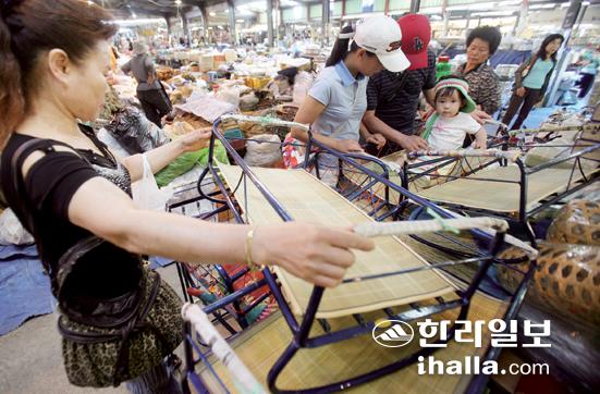 ![]() ▲제주시 민속오일시장을 찾은 사람들이 쇠구덕을 고르고 있다. 제주형 요람인 아기구덕은 대나무에서 쇠파이프로 재료가 바뀌면서 또다른 문화유산을 만들어내고 있다. /사진=강희만기자 hmkang@hallailbo.co.kr 아기 재우던 장방형의 대바구니…중간쯤엔 우물井자 모양의 그물 쇠파이프 재료 구덕도 생활유산 '웡이자랑 웡이자랑 웡이자랑 자랑자랑 웡이자랑/ 우리애기 잘도 잔다 웡이자랑 웡이자랑/ 우리애기 자는 소리/ 우리애기 노는 소리/ 웡이자랑 웡이자랑/ 웡이야 자랑아/ 웡이야 자랑아….' 귀에 익은 노랫말일 것이다. '웡이자랑 웡이자랑'으로 시작되는 이 노래는 '아기구덕 흥그는(흔드는)소리'다. 아기구덕을 끌어안고 어머니가, 혹은 할머니가 불렀던 달콤한 자장가였다. 제주섬엔 아기구덕이 있다. 대오리로 엮어 만든, 아기를 눕혀 재우는 장방형(長方形)의 바구니다. '제주어사전'엔 이를 제주도 특유의 육아기구로 써놓고 있다. 아기구덕은 크기가 일정하지 않다. 집안마다 주문하는 게 조금씩 다른 탓이다. 최근 서귀포시 호근동 김희창씨가 엮은 아기구덕은 길이 66㎝, 폭 33㎝, 높이가 23㎝쯤 됐다. 여느 구덕이나 차롱(본보 5월 18일자 7면)에 비해 대의 굵기가 두껍다. 아기를 눕혀 재우는 몇해 동안 아기구덕을 끊임없이 흔들어야 하는 탓이다. 얇은 대오리를 쓰면 오래가지 못한다. 바닥과 입구의 중간쯤에 우물정(井)자 모양으로 끈을 그물처럼 얽는 게 포인트다. 김희창씨가 제작한 아기구덕은 14㎝ 높이쯤에 그것을 장치했다. 구덕 밑바닥에 아기를 곧바로 누이지 않은 것은 그만한 이유가 있다. 20년 넘게 제주시, 서귀포시 오일시장에서 제주산 죽세품을 팔고 있는 강춘생씨(76·제주시 도련2동)의 말이다. "아기구덕 중간쯤에 새끼끈을 서로 엮어 만든다. 그 위에 보릿짚을 깔고 천을 덮는다. 갓난 아기가 그대로 소변을 보더라도 보릿짚이 빨아들인다. 여름엔 보릿짚위에 삼베를 깔았다." 구덕 가운데 부분을 엮는 재료는 질긴 칡덩굴 같은 것을 썼다. 요즘 만들어지는 아기구덕엔 주변에서 흔하게 구할 수 있는 노끈을 이용한다. 아기구덕의 빛깔과 부조화를 이루는 듯 해 아쉽다. 아기구덕은 다른 구덕이나 차롱보다 비싼 가격에 팔린다. 굵은 대를 엮는 게 힘겨운 데다 아기구덕은 깎지 않고 사간다는 속설 때문에 그런 것이라고 했다. 대나무로 짠 아기구덕은 1960년대 중반 무렵 '쒜(쇠)구덕'이 나오면서 설 자리가 좁아진다. 하지만 이는 여러 생활문화유산이 현대화에 밀려 형체를 잃어가는 것과는 다르지 않을까. 재료가 바뀌고 모양이 조금 달라졌을 뿐 쇠구덕은 아기구덕을 썼던 제주사람들의 삶의 양식을 이어받고 있어서다. 제주시 삼도2동에서 재성기업을 운영하는 박연석씨(66)는 '유아용 조립식 흔들침대'로 특허를 땄다. 흔들침대는 다름아닌 쇠구덕이다. 전남 강진 출신으로 10대에 제주에 정착한 그는 45년전쯤, 표선면에서 우연히 아기구덕을 봤다. 바닥이 평평해서 아기 재우는 사람들이 힘들겠구나 싶어 밑을 둥그렇게 만든 쇠구덕을 고안해냈다. 초기엔 건축현장에서 나온 폐고무를 썼는데 무게 때문에 방바닥에 자국이 생겼다. 10여년쯤 뒤 가는 쇠파이프로 재료를 바꿨다. 침상격인 중간부분은 스프링으로 처리했다. 아기구덕의 제작 원리 그대로 만들었다. 1997년엔 아예 특허를 냈다. 쇠구덕은 요즘 한달에 30~40개씩 주문이 들어온다. 시장 상인들이 요청하는 경우가 대부분이다. 혼자서 쇠구덕을 만드는 박연석씨는 "20년전쯤만 해도 한달에 백개가 넘는 주문이 이어졌지만 지금은 예전만 못하다"면서도 "나이 지긋한 분들은 딸, 며느리, 손녀에게 아이 잘 키우라며 지금도 쇠로 만든 아기구덕을 장만해준다"고 말했다. /진선희기자 jin@hallailbo.co.kr 남자가 왜 구덕을 엮을까 ![]() ▲서귀포시 호근동 김희창씨가 엮은 아기구덕 "예전엔 여자들이 아이를 낳은 뒷날부터 밭으로 향했다. 이때 아기구덕이 필요했다. 갓난 아이를 구덕에 눕히면 함께 밭에 데려갈 수 있었기 때문이다." 서귀포시 호근동 호서노인회에서 구덕을 짜는 노인중 한명인 허수영씨(74)는 그렇게 말했다. 아이 키우기와 집안일, 밭일까지 도맡아야 했던 섬 여인들에게 아기 구덕은 필수품이었다. 밭일을 하더라도 아이는 여자가 돌봐야 했다. 아니면 아이의 언니 몫이 되거나. 구덕을 엮는 사람들이 대개 남자인 이유도 다른 데 있는 게 아니다. 여자들은 집에서 구덕을 엮을 짬이 안났다. 실제 지금 구덕을 짜고 있는 노인들이 그런 이유를 댔다. 1930년대 후반의 제주도풍속을 정리한 일본인 이즈미 세이치씨는 제주여성의 노동 강도를 다음과 같이 썼다. "제주여성, 특히 주부일의 주된 것은 육체적 노동으로 밭갈이 뒤의 흙덩어리 부수기, 파종, 흙밟기, 제초, 탈곡, 맷돌, 절구, 양돈, 양계, 물긷기, 취사, 부역 등이다. 정신적 노동으로는 육아, 부조, 조상제와 집안제사 시행이다." 그렇다면 섬의 남성들은 이 시기에 무슨일을 했을까. 우마목축, 우마를 이용한 농사, 수확시 일부 작업, 숯굽기, 밭갈이가 육체적 노동에 속했다. 정신적 측면에서는 유례적 촌제, 성장하는 남자 아이들의 교육, 계의 감리를 꼽았다. 이방인의 눈에