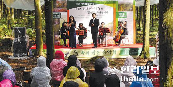 ![]() ▲17일 제주시 비자림로 물찻오름 입구 삼나무숲에서 열린 사려니 숲길 걷기 개막행사에는 흐린 날씨임에도 불구하고 수많은 도민과 관광객이 몰려 성황을 이뤘다. /사진=강희만기자 17일 비자림로 물찻오름 입구 삼나무숲에서 열린 '사려니 숲길걷기' 개막행사는 태고의 자연의 싱그러움을 만끽하려는 참가자들로 대성황을 이뤘다. 잔뜩 흐린 날씨 속에서도 이른 아침부터 어린 자녀들을 동반한 가족단위, 직장·단체 참가자, 관광객들의 발길이 이어져 숲길걷기 체험행사에 대한 높은 관심을 나타냈다. ['사려니 숲길걷기' 개막일 행사장 풍경] ![]() 강만생 제주도산악연맹회장 ![]() 김태환 제주특별자치도지사 한편 개막에 앞서 사려니 숲길 소개에 나선 현원학 제주생태교육연구소장은 "천천히 걸으면서 숲의 경관과 향기를 맡고 사색하는 길을 가슴에 담아갈 수 있을 것"이라고 강조했다. 또 "앞으로 수 년 내에 세계인이 모두 찾아와서 걷고싶은 명품숲길 문화를 제주에서 꼭 이룰 수 있길 희망한다"고 얘기했다. ![]() 개막식이 끝난 후 김용하 도의회 의장 등 참가자들이 사려니 숲길 걷기에 나섰다. /문미숙기자 msmoon@hallailbo.co.kr 피톤치드 향 발산 편백나무 기념품 인기 서귀포시산림조합, 탐방객에 제공 서귀포시산림조합이 17일 진행된 사려니 숲길걷기에서 체험행사에 걸맞는 이색 기념품을 제공해 참가자들로부터 호평을 받았다. 서귀포시산림조합은 지름 7~8㎝ 크기의 목걸이용과 9~10㎝ 크기의 찻잔 받침대 용도의 기념품을 제공했다. 이 기념품은 15~20년생의 편백나무를 이용해 만든 것으로 이날 일반에 첫 선을 보였다. 오형욱 서귀포시산림조합 상무는 "제주에서 흔히 볼 수 있는 편백나무는 널리 알려진 것처럼 피톤치드를 많이 발산하는 나무"라며 "숲길걷기 체험행사 참가자들이 일상생활에서 나무 향을 맡으며 이용할 수 있도록 만든 기념품이자 나무의 소중함을 홍보하기 위한 홍보물이기도 하다"고 소개했다. 특히 이 기념품에 이용된 편백나무는 숲가꾸기로 이용된 나무 중 간벌목으로 수집한 것이어서 향후 편백나무의 부산물을 활용할 수 있는 방안도 제공할 수 있을 것으로 기대되고 있다. 산림조합이 아이디어를 짜내 준비한 기념품 2500개는 순식간에 동이 났으며, 다음주 행사에 다시 2500개를 준비해 제공할 계획이다. 참가자들의 반응을 보고 또 다른 제품을 만들어 상용화하는 방안도 모색하고 있다. ![]() ▲참가자들은 이날 감미로운 현악사중주와 성악으로 이뤄진 클래식 선율에 매혹됐다. 5월의 초록이 눈부신 비자림로 숲속에 클래식 선율이 울려퍼졌다. 사려니 숲길걷기 개막일인 17일 물찻오름 입구 삼나무 숲에선 개막행사로 '숲속의 작은 음악회'가 열려 숲길걷기 참가자들은 감미로운 현악사중주, 성악 선율과 하나가 됐다. 무대에 오른 소프라노 김지은, 테너 장호진씨는 한라챔버오케스트라의 현악사중주 연주에 맞춰 우리가곡인 '봄처녀', '꽃구름속에', 요한 슈트라우스의 '메리 위도우' 중 '사랑의 이중창'을 들려줬다. 이어 현악사중주단은 베토벤의 '그대를 사랑해', 브람스의 '왈츠', 드보르자크의 '유모레스크'를 연주해 무대 주변을 가득 채운 관람객들을 고운 클래식의 선율속으로 안내했고, 관람객들은 연주가 끝날 때마다 박수로 화답했다. 하늘을 찌를듯 울창한 삼나무숲 사이사이에 놓인 삼나무 의자를 모두 채운 숲길걷기 참가자들은 숲속에서 만난 음악회가 색다르고, 멋진 추억을 담아가게 됐다고 반가워했다. /문미숙기자 msmoon@hallailbo.co.kr ![]() ▲출발에 앞서 숲길 걷기 참가자들이 자연보호 슬로건을 앞세워 기념촬영하고 있다. 사려니 숲길 걷기는 단순히 숲길 걷기만을 말하려는 것은 아니었다. 출발선에 선 도민과 관광객들은 숲과 인간의 관계에 대해 다시 한번 생각하는 기회를 가졌다. "숲은 인간의 생명이며 희망입니다." 17일 사려니 숲길 걷기 행사는 이 슬로건을 내걸고 자연보호 캠페인과 함께 시작됐다. 숲길을 단순히 걷기만을 위함이 아닌 대자연을 보고 만지고 느끼면서 자연이 우리 인간에게 얼마나 소중한 존재인지 다시금 깨닫는 계기가 된 것이다. 또한 이날 우리들의 건강을 지키자는 각종 캠페인과 무료 건강검진도 실시됐다. 한국건강관리협회 제주지부는 이날 숲길 들머리(개막식 행사장)에 부스를 설치해 놓고 건강캠페인을 벌였다. 이날 건강관리협회 직원 10여명은 사려니 숲길을 찾은 도민과 관광객들을 대상으로 건강 체크와 기본 상담을 진행했고, 금연 상담을 통해 금연패치, 금연껌, 금연사탕 등을 제공하기도 했다. ![]() 한국건강관리협회 제주지부는 이날 숲길 들머리(개막식 행사장)에 부스를 설치해 놓고 건강캠페인을 벌였다. <저작권자 © 한라일보 (http://www.ihalla.com) 무단전재 및 수집·재배포 금지 > |