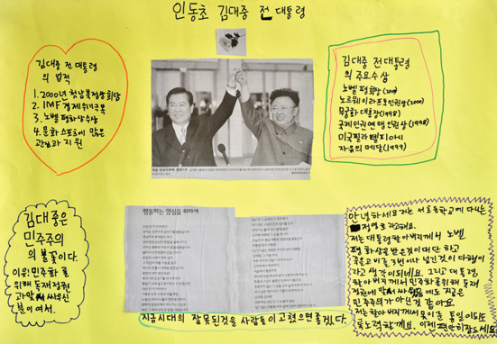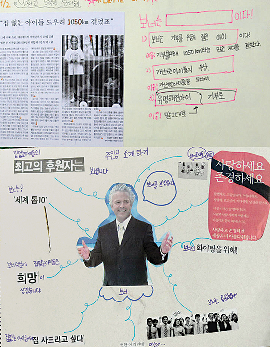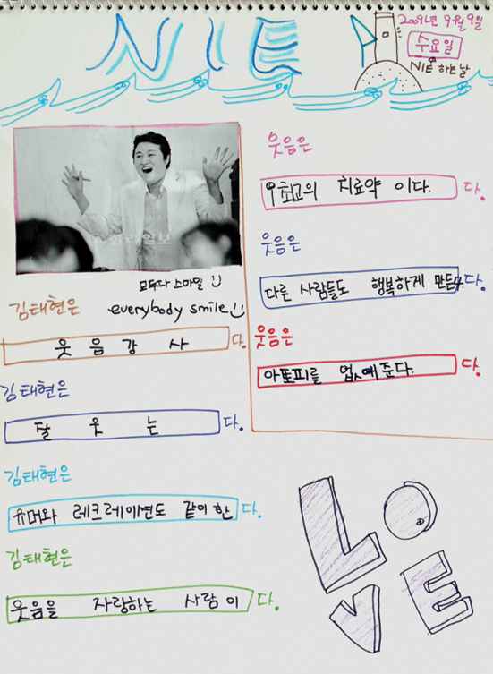 유명인·스포츠스타·소시민·어린이 등 어떤 인물이냐에 따라 접근방법 달라 교훈을 억지로 강요하는 수업은 금물 세상에는 67억명의 사람이 살고 67억 가지의 무수히 많은 생각과 삶의 모습이 있다. 유능한 사람, 지식이 많은 사람, 도덕적인 삶을 산 사람, 타인을 위해 헌신하는 삶을 산 사람 등 인물마다 그 인물만이 가진 삶의 모습이 있다. 또 신문 속에는 매일매일 다양한 사람들의 이야기가 소개된다. 신문 속에 등장하는 사람은 누구나 다 아는 명사에서부터 소시민, 때론 범법자까지 다 있다. 전근아(NIE 지도사)씨는 인물기사 활용을 위해 서거하신 고 김대중 전 대통령에 대한 기사를 선택했다. '김대중은 ○○○다'라는 기사를 통해 사람들이 인물에 대해 ○○○이라고 말하는 이유를 읽도록 했다. 그리고 신문에서 김대중 전 대통령이 높이 평가되는 점을 찾아보도록 하고 아이들이 인물 광고 해보기 수업을 진행했다. 이어 아이들이 직접 인물을 소개해보는 시간도 가졌다. ![]() ![]() ![]() ![]() ![]() ![]() 한라일보에 연재중인 '이 사람이 사는 법'도 인물기사를 활용한 자료로 충분하다. '웃음강사'로 활동하는 김태현씨에 대한 기사를 아이들과 함께 읽고 '김태현은 ○○○다' '웃음은 ○○○다'를 채워보도록 했다. 또래 어린이들을 다룬 기사도 아이들에게는 훌륭한 수업교재로 활용할 수 있다. 11살 밖에 안된 미국 소년 보너가 집 없는 아이들을 돕기 위해 장기간 도보여행을 하면서 모금운동을 했다는 기사를 통해 '보너는 ○○○다'라고 이야기하고 보너를 신문자료를 활용해 소개해보기도 했다. 수업 후 활동은 인물에게 편지쓰기, 인물이 되어 일기쓰기, 논평쓰기, 자서전 쓰기, 역사그래프 그리기, 인물 신문 만들기, 인물광고하기, 상장 만들기, 트로피 그리기 등 인물기사의 내용에 따라 다양한 활동을 할 수 있다. 인물기사를 활용해 수업할 경우에는 아이들과 이야기해 볼 수 있는 이야깃거리가 많아야 한다. 주의할 점은 아이들에게 교훈을 강요하는 수업이 이뤄지면 아이들의 마음은 닫히고 만다는 것이다. 아이들 스스로 느낄 수 있도록 접근하는 것이 필수적이다. /이현숙기자 hslee@hallailbo.co.kr ♣NIE 활용 통합교과(6) ▶목표=인물 기사를 읽고 인물이 한 일을 알 수 있다. 기사를 통해 인물의 생각이나 가치관을 이해할 수 있다. 인물이 한 일에 대한 자신의 생각을 이야기할 수 있다. ▶대상=초등 4~6학년 ▶활동=▷신문자료를 활용해 기사 속 인물 소개·광고하기 ▷인물에게 편지쓰기 ▷격려·칭찬글 써주기 ▷기사를 읽고 인물에게 궁금한 질문 써보기 ▷상장·트로피 만들어주기 ▷'○○○은 △△△이다' 채워넣고 이유 말해보기. ♣'인물기사 활용 언어영역' 연결 교과 ▷1학년1학기 넷째마당 '친구에게 마음을 전하는 글 써보기' ▷2학년1학기 첫째마당 '칭찬하는 글 써보기' ▷3학년1학기 둘째마당 '인물의 성격 알아보기' 넷째마당 '주변에서 (영희)같은 친구를 찾아 소개하기' ▷3학년2학기 첫째마당 '친구들에게 소개하고 싶은 내용 조사하기' ▷4학년1학기 다섯째마당 '생각하거나 느낀 점을 글로 써보기' ▷4학년2학기 넷째마당 '이야기(기사)를 읽고 인물의 성격 말해보기' ▷5학년1학기 둘째마당 '더 알고싶은 것 조사하기' 셋째마당 '인물의 다양한 삶을 이해하며 이야기 읽기' ▷5학년2학기 셋째마당 '인물의 마음과 행동을 생각하며 읽기' 다섯째마당 '글에 직접 드러나지 않는 내용 알아보기' ▷6학년2학기 다섯째마당 '글쓴이의 꿈과 내꿈 비교하며 읽기' [전문가 Tip]"다른 삶 인정하고 이해하도록 해야" ![]() 특히 아이들이 잘 알고 있는 인물이거나 독특한 삶을 산 인물일수록 아이들의 흥미를 이끌어 낼 수 있다. 아이들은 연예인이거나 인기있는 스포츠선수들의 이야기에 보다 적극적으로 반응한다. 이들이 성공 스토리와 비하인드 스토리는 재미를 주는 동시에 교훈을 담고 있다. 그러나 아이들의 흥미로만 인물을 다룰 수는 없다. 인물수업을 하는 궁극적인 취지는 아이들에게 정형화된 삶의 풍경이 아닌 다양한 삶의 모습을 이해하고 다양한 생각이 나타나는 이유를 알게 됨으로써 각기 다른 삶을 인정하고 그 안의 삶의 철학을 가르칠수 있기 때문이다. 소시민이 의미있게 살아가는 모습이나 고통받은 사람들의 모습을 다룬 기사도 좋다. 요즘 아이들은 화려한 조명을 받고 싶어 하는 경우가 많다. 하지만 그렇지 못한 삶의 모습이 더 많고, 화려한 조명이 아니더라도 더 의미있는 삶이 있음을 스스로 알 수 있게 하는 것이 무엇보다도 중요하다고 할 수 있다. 그리고 아이들과 비슷한 또래의 아이의 이야기가 기사화된 것으로 활용을 해도 좋다. <전근아 한라일보NIE자문위원> <저작권자 © 한라일보 (http://www.ihalla.com) 무단전재 및 수집·재배포 금지 > |