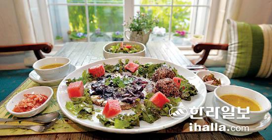 ![]() ▲샤라의 정원이 추천하는 흑돼지 스테이크와 오곡밥, 채소가 곁들여진 '모다들엉' 강경민기자 조미료는 일체 사용하지 않고 효소·와인·허브로만 맛 살려 야채도 텃밭에서 친환경재배 세계자연유산 거문오름으로 잘 알려진 제주시 조천읍 선흘리에 자리잡은 음식점 '샤라의 정원'. 초록색 잔디마당 울타리를 따라 흐드러지게 피어난 키작은 보라색과 분홍색 안젤로니아가 먼저 시선을 붙드는 집은 문패가 없었다면 정원이 예쁜 가정집으로 착각할 뻔 했다. 식당문을 열고 들어서자 주인장 신영씨가 반긴다. "먹을거리는 맛이 있으면서도 건강에도 이로워야 한다는 생각으로 모든 음식을 만든다"는 그녀는 식당에선 이름 대신 '요정(요리하는 정원사)'으로 통한다. 식당 내부도 예사롭지가 않다. 친구끼리 맛난 음식과 효소차를 앞에 두고 수다를 떨 수 있는 자리서부터, 길다란 나무탁자와 의자가 놓인 공간까지 여느 식당에선 쉽게 찾아볼 수 없는 특별함이 가득하다. 그녀가 추천하는 음식 '모다들엉'은 이름부터가 생소하다. 오디효소와 유기농 치즈가 어우러진 흑돼지 스테이크와 오곡밥, 친환경 계절스프와 샐러드가 커다란 접시를 화려하게 한가득 채우는 요리다. 스테이크는 제주산 흑돼지와 쇠고기를 갈아서 와인과 허브에 하루 이상 재워뒀다 요리할 때 다진 양파와 고추, 들기름을 섞어 둥그렇게 모양을 만들어 프라이팬에서 익힌다. 다 익어갈 즈음 유기농치즈를 뿌린후 직접 담근 오디효소와 열매, 버섯, 양파로 만든 소스를 끼얹는다. 커다란 접시에 완성한 스테이크와 오곡밥을 주먹밥 모양으로 만들어 올리고 상추와 수박으로 곁들여 낸다. ![]() ▲닭고기와 와인, 토마토소스로 만든 '미친닭' ![]() ▲건강에 좋은 음식을 고집하는 신영씨. 샤라의 정원이 선보이는 '미친닭'도 한 번 맛보면 또 생각나는 음식이다. 우리가 평소 즐겨먹는 닭고기를 와인과 각종 허브에 하루 이상 재워뒀다 물에 넣고 어느정도 익혀 스파게티 면과 가래떡, 토마토소스를 넣어 조린후 치즈를 뿌려낸다. 그녀가 만드는 음식엔 고집스러울 정도의 철학이 깃들어 있다. 조미료는 전혀 쓰지 않고 대신 허브와 효소로 맛을 내고, 재료도 가능한 친환경과 유기농을 고집하는 철저한 자연식단이다. 4년 전 식당을 꾸리게 된 이유도 "분주한 삶에서 받는 스트레스로 현대병이 많아지는 요즘, 자연의 맛을 최대한 살려 우리몸에 좋은 슬로푸드를 널리 퍼트리고픈 마음"에서라고 했다. 실제로 영어교사였던 그녀는 뚜렷한 병이 없는데도 몸이 좋지 않아 고생하던 차에 효소에 대해 공부하기 시작했고, 해마다 6월이면 부안산 친환경오디를 구입해 항아리에 설탕과 함께 섞어 오디효소를 담가먹고 있다. 혈당을 낮추고 비타민·칼슘이 풍부하기로 알려진 오디로 만든 효소는 3년 이상 숙성시킨 것을 음식에 두루 활용하고, 차로도 선보인다. 그녀가 효소를 담그는 재료는 오디 외에도 귤, 쑥, 구지뽕 등 여러가지다. 이 뿐만이 아니다. 음식에 들어가는 야채 대부분은 식당 옆에 있는 텃밭에서 직접 친환경 재배해서 쓴다. 상추며 오이, 고추, 깻잎, 가지, 허브, 바질 등을 매일매일 쓸 만큼만 뜯어다 샐러드와 오이피클을 만든다. 손님들에게 그녀는 음식이 입맛에 맞았냐고 묻곤 한다. "조미료맛에 익숙해진 입맛에는 우리집 음식이 2% 부족하다 싶을 수도 있어요. 하지만 건강을 위해 조금은 싱겁게, 그리고 제철 친환경재료로 정성껏 만든 음식을 손님들이 맛있다며 접시를 싹 비워낼 때가 가장 행복해요." 2명이 먹을 수 있는 '모다들엉'과 '미친닭'은 각각 3만원, 효소차는 한 잔에 5000원이다. 영업은 오전 11시부터 오후 6시까지. 매주 화요일은 쉰다. 문의 070-7773-9631. ![]() <저작권자 © 한라일보 (http://www.ihalla.com) 무단전재 및 수집·재배포 금지 > |