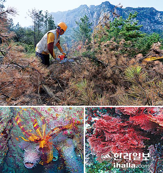 ![]() 2013년 5월 말부터 용수공급을 가동한 어승생 제2저수지. 지난해 여름 기상 관측 이래 제주지역 최악의 가뭄 때문에 제한급수가 이뤄지기도 했다. 사진=한라일보 DB '기후변화대응 종합계획' 투자대비 사업효과 분석 필요 자연재해 많아 풍수해보험 가입률 전국 최고 수준 극심한 가뭄 들어 지하수 해수 침투·물부족 우려 당초 사업계획 중 일부만 추진·일부는 사장 위기 제주도는 태풍·해일·폭우·돌풍·폭설 등 다양한 자연재해가 돌발하고 기후변화에도 민감한 지역이다. 특히 다른 지역과 달리 자연재해 피해 비중이 커서 2000년 이후 올해 8월까지 총 51건의 자연재해가 발생해 64명의 인명피해와 3494억8900만원의 재산피해를 일으킨 것으로 집계됐다. 제주도의 기상이변에 따른 취약지역의 재해예방사업이 필요한 이유다. ▶재해방지시스템 구축=지난 1959년 9월 17~18일 제주도를 강타한 사라호 태풍 이후 제주도에는 모두 125회의 기상재해가 발생했다. 이 때문에 사망 81명·실종 54명·부상 176명을 포함해 모두 311명의 인명피해가 발생했으며, 4206억3000만원의 재산피해가 난 것으로 집계되고 있다. 제주도민의 안전을 위협하는 이 같은 재해를 예방하기 위해 제주도는 지난 2009년부터 '기후변화에 대응하기 위한 재난취약지역 재해예방 사업'을 진행하고 있다. 재난감시용 CCTV 설치 및 예·경보시스템 정비사업과 하천 등 재난취약지 제거사업 등이 이에 해당한다. 인명과 재산피해를 최소화하기 위한 방안으로 시행 중인 풍수해보험에 대한 관심도 다른 지역보다 높다. 2013년 제주지역 풍수해보험 가입률은 14.9%(2012년도 13.2%)로 전국 평균 6.53%(2012년도 4.9%)를 크게 웃돌아 전국 1위 수준을 이어가고 있다. 불확실한 기상이상현상을 대비하기 위한 재난 예·경보 시스템의 과학화 및 현대화, 수해 피해를 막기 위한 지방하천·소하천·재해위험개선지구·서민밀집지역·급경사지 붕괴위험지역 재해예방사업 등도 재해방지시스템 구축사업으로 진행되고 있다. 지구온난화로 태풍의 강도가 강해지면서 재난 방재기준을 마련할 필요성이 제기됨에 따라 강우·적설·강풍·해일·해수면 분야 등에 적용 가능한 기후변화 대응 재난방재기준 수립 지침도 내년에는 마련할 예정이다. 이는 제주지역에 맞는 장기적인 방재기준과 방재대책 수립절차를 제시하게 된다. ![]() 소나무 재선충병(사진 맨 위), 마을어장의 생태계 변화를 보여주는 아열대성 동식물인 산호붙이히드라와 참곱슬이.(왼쪽부터) 사진=한라일보 DB 해양생태계의 변화는 기후변화, 육상오염원 등 외부환경 변화, 수산업 환경변화 등 다양한 요인에 영향을 받는다. 하천환경 변화에 따른 해양생태계 복원 연구는 하천개발 등이 해양생태계에 미치는 영향을 조사하고 복원할 수 있는 연구이기도 하다. 이에 따라 제주도는 2013년부터 2015년까지 3개년 사업으로 6개 마을어장을 대상으로 환경변화에 따른 해양생태계 복원연구사업을 시행 중이다. 최근 온난화에 따른 마을어장 내 갯녹음 현상이 심화되고 해조료와 패류의 서식상황도 황폐해지고 있다. 이에 따라 제주도 마을어장 생태환경 및 수산자원변동 추이 분석, 기후변화 등에 따른 어장생태계 변화 모니터링 및 수산동식물의 생산력 변동 조사, 마을어장의 효율적 진단 등을 위해 15개 마을어장을 현장조사해 생태계 변화를 추적하고 있다. 마을어장의 지속적 생산을 위해 제주도 연안 마을어장에 바다숲을 조성하는 사업도 진행 중이다. ▶수자원 효율적 관리=제주도 지하에는 해수와 담수가 경계를 이루는 층인 담염수 경계면이 있다. 비가 많이 오면 지하수 함양량이 많아져 이 경계면이 하강하고, 가뭄이 들면 상승하게 된다. 비가 많이 오면 문제가 없지만 가뭄이 심각해지면 지하수에 해수가 침투할 수 있다는 것이다. 지난해 제주도에는 기상청 관측 이래 최악의 가뭄이 발생해 이용 가능한 지하수량이 1일 130만4000톤까지 떨어져 실제 이용가능한 145만7000톤보다 크게 부족한 상황이 발생했다. 중산간 제합 급수도 바로 이러한 문제 때문이었다. 이 때문에 제주도는 53개소에 해수침투 관측망을 설치하고, 57개소에는 지하수위 관측망을 설치해 지하수 과다 사용을 막기 위한 모니터링을 실시하고 있다. 특히 우리나라에서는 처음으로 관측망 통합관리 시스템 구축 사업을 내년부터 시작할 계획이다. 해수침투와 지하수위에 대한 종합분석이 어렵고 시간도 많이 소요되는 문제를 해소하기 위해서다. 또한 지하수 부족 문제를 해결하기 위해 총 324만톤의 농업용수를 확보할 수 있는 저수지를 조성하고 있다. 현재 표선면 성읍, 한림읍 옹포, 구좌읍 송당, 대정읍 서림 지구에 많게는 82%에서 적게는 4%의 공정율로 진행 중인 이 저수지 조성 사업은 가뭄 때에도 농업용수를 확보해 지하수 자원을 보호해줄 것으로 기대된다. ▶사업효과 분석 필요=기후변화는 지역과 국가는 물론 전 세계적으로 환경·산업·문화·경제 분야와 생활양식에 이르기까지 광범위한 영향을 미치고 있다. 유엔이 최우선 아젠다로 추진하고, 국가가 기후변화대응 종합계획을 마련해 추진하는 것도 그 심각성을 알고 있기 때문이다. 제주도 역시 