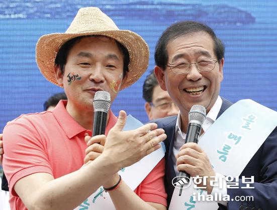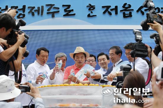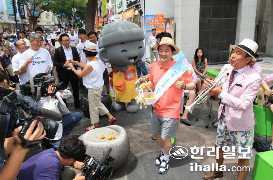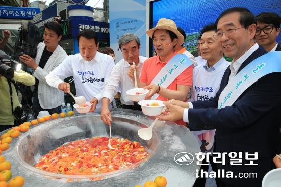 ![]() ![]() ![]() ![]() 원희룡 제주특별자치도지사가 박원순 서울시장을 초대해 함께 진행하는 이날 캠페인의 주 무대는 명동지하쇼핑센터 15번과 18번 출구사이에 마련됐다. 원 지사와 박 시장은 무대에 마련한 대형 화채그릇에 청정제주 과일화채를 만드는 과일화채 나눔 퍼포먼스를 펼친 뒤 홍보부채와 감귤을 나눠주는 거리홍보에 나섰다. <저작권자 © 한라일보 (http://www.ihalla.com) 무단전재 및 수집·재배포 금지 > |