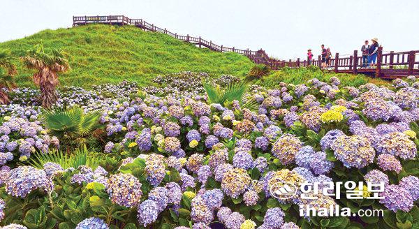![]() 7월이면 제주섬에는 오묘한 빛깔로 물들이는 수국이 지천에 피어난다. 송악산 정상에서 가파도를 향해 뻗은 분화구를 따라 수국밭이 펼쳐져 있다. 강경민기자 장마철 피기 시작해 백록담 정상까지 물들여 꽃잎마다 다른 오묘한 빛깔로 7월 화려하게 어느곳이나 그렇지만 제주섬에서도 7월에 피는 꽃을 보기란 쉽지 않다. 봄꽃은 지고 가을꽃은 아직 꽃대를 올리기도 전이어서다. 그래서 여름 한철 제주도 지천에 피어난 수국이 많은 이들의 눈과 가슴을 홀린다. 제주의 아름다운 숲의 가치를 알리기 위해 매월 이달의 꽃을 선정하고 있는 국립산림과학원 난대·아열대산림연구소는 7월의 꽃으로 산수국을 선정했다. 때맞춰 제주관광공사도 7월 사진 찍기 좋은 곳으로 '제주 수국 명소 5'를 발표했다. 서귀포시 표선면 성읍리의 보롬왓 수국길은 지난달까지만 해도 메밀꽃으로 뒤덮였던 곳이지만 지금은 길 양옆으로 펼쳐진 수국이 라벤더와 어우러져 이색적인 풍경을 자랑한다. 산방산으로 가는 길에 만나는 사계리 수국길과 돌담 너머로 풍력발전기와 묘한 조화를 이루는 김녕리 수국길도 있다. 카멜리아힐과 한림공원, 휴애리 같은 관광지에서도 수국밭을 누빌 수 있다. 종달리 수국길을 으뜸으로 치는 이들도 있고, 제주 해안 곳곳과 심지어 백록담 정상에서도 수국은 피어난다. 최근에는 송악산이 수국 명소로 유명세를 치르고 있다. 이곳에서 만난 한 관광객은 "인터넷을 통해 요즘 가장 핫한 수국이 여기 있다는 것을 보고 청주에서 당일치기 여행을 왔다"고도 했다. 이 같은 반응이 극성이 아니라는 건 보는 이들의 한결같은 반응을 통해서도 알 수 있다. 땀 흘리며 숨가쁘게 탐방로를 오르던 초로의 남성도 눈 앞에 펼쳐진 풍경에 감탄사를 자아냈다. "끝내준다. 이런 건 파노라마로 찍어야 해." 동행도 "그래야겠다"며 카메라를 들어올렸다. 송악산 수국을 접한 이들은 이곳을 '수국정원'이나 '수국터널'로 명명했다. 송악산 정상에서부터 가파도를 향해 뻗은 분화구를 따라 흘러내린 듯 길게 늘어선 수국밭이 수국정원으로 불러도 손색 없을 만큼 화려하다. 수국 중에서 제주가 자생지인 것으로는 산수국, 탐라수국, 성널수국, 바위수국, 등수국 등이 있다. 송악산이나 길가에서 흔히 보이는 꽃무더기가 풍성한 수국은 관상용 목적으로 심은 그냥 '수국'이다. 장마가 시작할 때쯤 피어나기 시작한 제주 수국은 길게는 8월까지 지천에서 피어난다. 제주사람들은 수국을 도체비낭(도깨비나무)이나 도체비고장(도깨비꽃)으로 불렀다. 붉은색에서 파란색까지 꽃의 색깔이 변하기 때문에 특히나 변덕이 심했다는 제주 도깨비의 마음과 닮았다는 것이다. 실제 멀리서는 자줏빛으로 보이던 수국에 눈을 갖다 대면 흰색, 분홍색, 연두색, 노란색, 자주색 등이 뒤섞여 있음을 알 수 있다. 난대아열대산림연구소의 현화자 임업연구사는 "수정하는 과정을 거치면서 변하고, 토양의 알칼리성이 강하면 푸른색, 산성이 강하면 붉은색이 두드러지고, 다른 곳에 옮겨 심어도 변하고, 한 덩어리에서도 꽃잎마다 서로 다른 색을 띄어서 오묘하다"고 설명했다. <저작권자 © 한라일보 (http://www.ihalla.com) 무단전재 및 수집·재배포 금지 > |