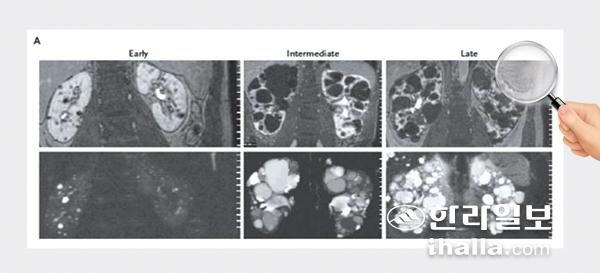 ![]() 상염색체 우성 다낭성 신증환자의 영상 소견. 사진=제주대학교병원 제공 50대 절반 이상서 단순 낭종 발견 크기 작고 무증상시 문제 없지만 벽 두껍거나 불규칙하면 암 의심 정기 추적 관찰하며 수술도 고려 최근 인기리에 종영한 드라마에서 주인공의 어머니가 유전성 다낭성 신질환에 의한 말기 신부전으로 투석을 진행하다 상태가 악화돼 주인공으로부터 신장이식을 받고 건강을 되찾는 모습이 그려진 적이 있다. 방송 이후 주인공과 그 어머니가 앓고 있는 유전성 다낭성 신증에 대한 관심이 높아지면서 이 병을 포함해 낭종성 신질환에 대한 궁금증을 갖고 병원을 찾는 환자들이 많아졌다. ![]() 건강보험심사평가원에 따르면 지난해 다낭성 신장병으로 진료를 받은 환자는 7506명이다. 다낭성 신장질환은 1000명 중 1명 꼴로 발생하는 데 양쪽 신장에 액체로 채워진 물혹(낭종)이 많아지고 커지면서 신장은 비대해지는 한편, 정상조직을 물혹이 차지하면서 기능이 점점 떨어지게 돼 결국 말기 신부전에 이른다. 이러한 낭종이 2개 이하로 발견되는 경우는 단순 신낭종으로 볼 수 있으나 3개 이상 발견되는 경우에는 정확한 감별이 필요하다. ▶단순 신낭종=단순 신낭종은 낭종성 신질환 중 가장 흔한 질환으로 젊었을 때는 찾아볼 수 없다가 나이가 들면서 발병한다. 일반인에게서는 50세 무렵에 절반 이상에서 단순 낭종이 발견된다. 대개 아무런 증상이 없이 지내다가 건강 검진 과정에서 시행한 복부초음파 검사에서 우연히 발견되는 경우가 대부분이다. 크기가 작고 증상이 없는 경우 특별한 치료 없이 경과만 지켜보며 그대로 둬도 별 문제가 없다. 다만 크기가 너무 커 주변 장기를 압박하는 경우, 또는 위치가 신기능에 영향을 미칠 수 있는 경우, 낭종에 합병증이 발생된 경우, 즉 낭종 내 출혈이 발생하거나 낭종에 염증이 있는 경우, 낭종 파열이 발생한 경우에는 수술 혹은 시술적 제거가 필요하다. 낭종 중 가장 문제가 되는 것은 악성종양이 의심되는 경우이다. 낭종의 악성도는 초음파나 CT 검사에서 '보스니악 분류법 (Bosniak classification)'에 따라 판정한다. 즉 낭종벽의 상태와 낭종 내 내용물의 성상에 따라 단순 신낭종과 복합성 신낭종, 그리고 낭종성 신장암으로 구분한다. 단순 신낭종은 낭종 벽이 매끈하고 얇으며 낭종 내부에 내부음영이 없이 완전히 검게 보이는 반면, 낭종벽이 두껍거나 불규칙하며 낭종 안에 두껍거나 불규칙한 중격이 보이고 독립적인 고음영 병변이 발견되면 낭종성 신장암으로 분류한다. 암의 가능성이 일부 존재하는 복합성 신낭종은 정기적인 추적관찰이 필요하며 암의 가능성이 높으면 수술을 고려한다. ▶유전성 다낭성 신질환=앞서 말한 것처럼 극중 주인공이 앓고 있는 상염색체 우성 다낭성 신질환(Autosomal dominant kidney disease,ADPKD)은 부모 중 1명에서 폴리시스틴(polycystin)이라고 하는 단백질을 만드는 유전자 (PKD 1, 2)에 결함이 있는 경우 발병하는 질환으로 상염색체 우성으로 유전돼 세대를 건너뛰지 않고 자녀에게 바로 50%의 확률로 유전된다. 이는 신장 유전성 질환 중 가장 흔한 질환으로, 전 세계적으로 400~1000명 중 1명에서 발생한다. 상염색체 우성 다낭성 신질환은 소아에서 발병하는 경우는 드물고, 대부분 성인이 되면 발병하며 보통 20대 이후부터 발생하기 시작하는데, 20대에는 낭종 개수가 적고 크기도 작아 증상을 잘 느끼지 못하는 경우가 많다. 30대 이상부터는 낭종이 커지면서 신장이 커다란 혹으로 만져지거나 좌우 옆구리가 아프고 혈뇨가 나타날 수 있지만, 낭종이 많이 커질 때까지 증상이 없어 검사를 하지 않으면 모르는 경우도 많다. 나이가 들수록 낭종의 개수가 많아지고 크기도 커지면서 고혈압이 대부분 발생하고, 신장 기능을 떨어뜨리게 되며 보통 30대 후반부터 신장기능이 감소하기 시작해 40~50대 사이에 신장기능이 10% 이하로 나빠져 투석이나 이식을 받아야 하는 경우가 발생하기 시작한다. 70대 이후에는 이 비율이 50% 이상으로 증가한다. 따라서 다낭성 신질환의 가족력이 있으면 증상이 없더라도 정기적인 신장 기능 검사와 초음파 검사를 받으면서 관리할 것을 추천한다. 그동안 다낭성 신질환은 저염식과 같은 식이요법 외에 사실상 병의 진행을 막을 수 있는 근본적인 방법이 없었다. 다행히 2015년 다낭성 신질환에 따른 신장의 용적증가를 늦추고 신기능 감소를 억제하는 치료제가 국내에 도입됐지만, 치료를 받을 수 있는 환자들은 많지 않았다. 보험적용이 안 돼 한 달 투약비용은 100만원을 훌쩍 넘긴다. 하지만 이 약이 최근 미국 식품의약국(FDA)에서 뒤늦게 다낭성 신질환 치료제로 승인됨에 따라 국내 보험적용에 대한 환자들의 기대감도 커지고 있다. 이 밖에 다낭성 신질환에서 도움이 되는 것으로는 혈압관리가 중요하며 평소 고혈압을 잘 관리해 주면 신장의 손상을 늦추는데 도움이 될 수 있다. 또한, 충분한 수분 섭취는 체내의 바소프레신(vasopressin) 호르몬을 감소시켜 신장의 낭종 크기를 줄이는데 도움을 줄 뿐만 아니라 다낭성 신장질환 환자에게 자주 발병하는 요로결석을 예방할 수 있다는 장점이 있어 평소 꾸준한 수분 섭