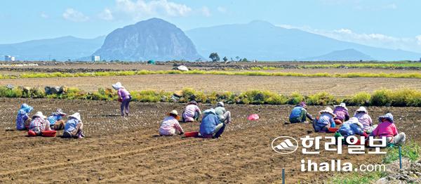 31일 서귀포시 대정읍 하모리의 한 밭에서 농민들이 무더위 속에서 마늘 파종 작업을 하고 있다. 강희만기자