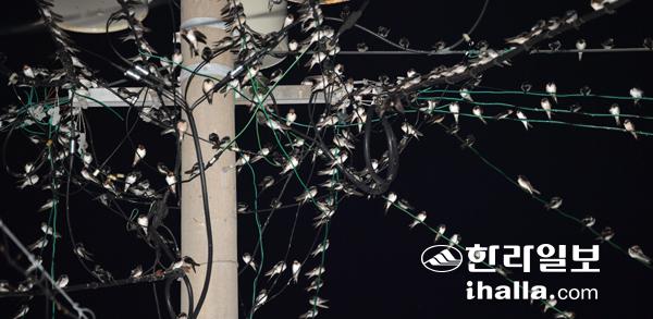 제비들이 월동지인 베트남 등 동남아시아로 떠날 준비를 위해 13일 저녁 제주시 구좌읍 세화리마을 전깃줄에 앉아 휴식을 취하고 있다. 강희만기자