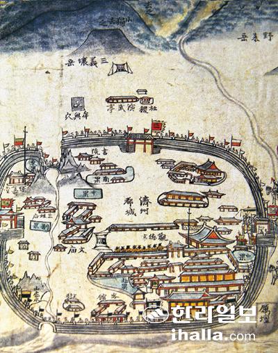 ![]() 제주 처음 공개 영주십일경 전체 영주10경에 없는 화북진 그림 있어 예나르 제주문자도전에 전시예정 #변방, 제주도 순력의 의미 이미 17세기에 유럽의 동인도 회사가 식민지 개척을 위해 호전적으로 아시아 진출이 점점 늘어났으며, 특히 사대국(事大國)인 중국의 명왕조가 불안해지면서 후금이 청으로 국호를 바꾸고는 급기야 조선을 침략하여 병자호란 후 조선의 미래가 불안해졌다. 조선의 민심이 동요하면서 재지사족(在地士族)의 향촌 자치권을 제한하고자 17세기 말이 되면 조선 전도를 유교원리주의자들이 지방 수령으로 부임하게 되고 전국적으로 무불(巫佛) 탄압이 자행되고 제주도 또한 그 무렵 이형상에 의해 당오백 절오백이 훼철된다. 특히 제주도인 경우 숙종 20년(1694) 6월에 병조참의였던 이익태(李益泰, 1633~1704)가 제주목사로 부임하게 되면서 당시 변방이었던 제주도의 정세를 엿보게 한다. 제주도에는 표류인이 많았는데 외국의 이양선이 자주 출몰했던 것은, 새로 일어선 중국 청나라의 불안한 정세를 반영한 것이었고, 또 일본 나가사키로 가는 국제적 항로의 중요한 길목이었기에 어느 때보다도 문무를 겸비한 관리가 더욱 필요하게 되었다. 제주목사 이익태는 6월 29일 화북소로 내려 한 달여 동안 제주에 적응한 후, 맨 먼저 한 일은 한라산에 오른 일이었다. 이틀 후에 관덕정에서 유생들을 대상으로 백일장을 치렀으며, 9월 9일 날부터 정의현을 시작으로 순력하기 위해 조천관, 별방소, 서귀소, 대정현, 애월소까지 순력을 마치고 9월 19일 제주영으로 돌아왔다. 순력이란 "봄·가을로 매번 절제사가 직접 방어(防禦)의 실태와 군민(軍民)의 풍속을 살피는 것을 말한다." 순력을 통해 군사, 행정, 공납 등 각종 제도의 허실을 고치고 폐해를 바로잡아 변방의 고을을 안정적으로 유지하기 위해 군사, 제반 행정, 경로, 상벌까지를 시행하는 것이다. ![]() 탐라순력도에 문묘, 서원, 운주당, 삼성묘, 관덕정 객관이 보인다. 제주시 소장 #'탐라십경'에서 '영주십경'으로 제주목사 이익태는 '탐라십경도 서'에서 "기묘한 바위 폭포는 곳곳에 볼 수 있다. 그러나 사람들이 모두 등한시하여 무심코 넘김으로써 사실을 기록하여 저술이라고 칭할 게 하나도 없다. 그러므로 육지에 있는 사람들은 들어 아는 게 별로 없는 것이 애석하였다" 라며 자신의 심중을 밝혔다. 그래서 이익태는 2년 동안 두 번의 순력을 바탕으로 풍속을 묻고는 볼만한 곳을 찾아내 지방 화공 고경욱에게 그 중 뛰어난 경치 10곳을 조그마한 병풍에다가 위에는 사적을 쓰고 아래에는 그림을 그리게 했다. 이익태의 '탐라십경도'를 보면 제주목 동쪽으로 시작하는데 조천관(朝天館), 별방소(別防所), 성산(城山), 서귀포(西歸浦), 백록담(白鹿潭), 영곡(靈谷), 천지연(天池淵), 산방(山房), 명월소(明月所), 취병담(翠屛潭) 등이다. 1702년 박성석(朴星錫, 1650~1709)의 후임으로 병와(甁窩) 이형상(李衡祥, 1653~1733)은 제주목사로 와서 유명한 '탐라순력도'를 남겼으며, 또 중국의 소상팔경(瀟湘八景)을 의식해 '제주팔경(濟州八景)'을 품제했는데, 그 팔경을 살펴보면 '한라채운(漢拏彩雲), 화북제경(禾北齊景), 김녕촌수(金寧村樹), 평대저연(平岱渚烟), 어등만범(魚等晩帆), 우도서애(牛島曙靄), 조천춘랑(朝天春浪), 세화상월(細花霜月)' 등이 그것이다. 그러나 이 팔경은 아쉽게도 제주도 동촌(東村, 정의현)의 풍광만을 지정하는 바람에 서촌(西村, 대정현)의 절경이 누락돼 있지만 '영주십경'을 다른 각도로 볼 수 있는 시각을 준다는 점에서 매우 흥미롭다. 매계(梅溪) 이한우(李漢雨)의 '영주십경' 등 숱한 문사(文士)들이 나름대로 아름답게 '영주십경'을 품제하기도 했다. 1841년 제주목사로 온 응와(凝窩) 이원조(李源祚, 1792~1872) 또한 '영주십경'을 품제했는데 "제주 선비 고경욱이라는 자가 영주십경을 잘 그렸는데, 예전의 것을 본 떠 새기면서 지도의 크기를 예전과 비교하여 3분의 1로 줄였다고 한다. 마을의 이름과 오름, 하천 중 이름이 널리 알려지지 않은 것은 생략하여 번거로운 것을 버리고 간략하게 만들고 먹(墨)을 채색(彩色)으로 바꾸어 눈을 즐겁게 해 편히 볼 수 있도록 하였다."라는 기록으로 보아 영주십경도를 잘 그리는 고경욱에게 '탐라지도'를 그리게 해 족자로 만들었다는 사실, 또 '영주십경도'는 선비화가 고경욱이 예전의 것을 본떠 새기면서 채색으로 바꿔 그렸다는 사실도 알 수 있다. 현재 전해오는 영주십경 관련 그림으로는 국립민속박물관 소장의 일명 '제주도도(濟州島圖)'의 '탐라도총(耽羅都摠)', '영곡(靈谷)', '백록담(白鹿潭)', '산방(山房)' 등 4폭과 제주십경도(濟州十景圖)'의 '명월소', '천지연', '서귀소', '성산', '산방', '취병담', '조천관', '영곡', '백록담', '별방소' 등 10곳을 그린 그림인데 채색이 가미된 비교적 작은 화첩으로 경쾌한 채색으로 보아 마치 위 기록의 사실처럼 고경욱이 그렸다는 그림으로 여겨질 정도다. #제주목도성지도(濟州牧都城之圖) 이 '제주목도성지도'는 현재 12폭 전모를 볼 수 있는 귀중한 회화식 옛 지도이다. 이 지도의 등장 경위를 말해보면, 제주도 저지 예술인 마을에 있는 예나르(대표 양의숙