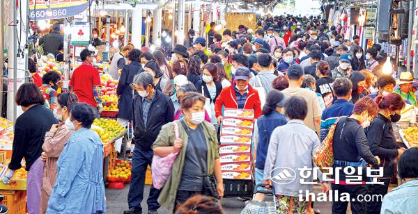 22일 추석을 일주일여 앞두고 열린 제주시민속오일시장에 오랜만에 많은 인파가 찾아 활기 넘치는 모습을 보이고 있다. 강희만기자