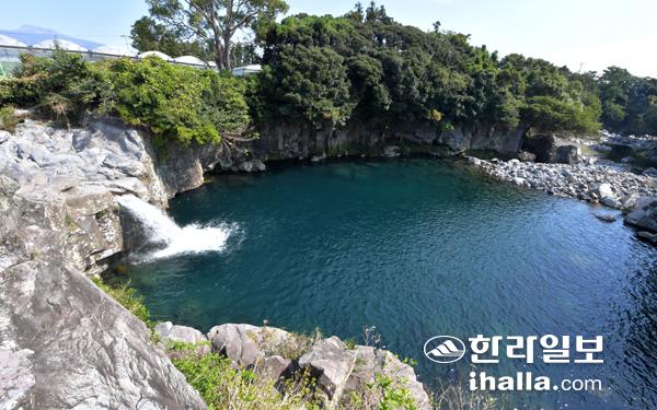 19일 서귀포시 강정동 강청천 건천이던 냇길이소가 하천에 물이 흐르면서 폭포를 이뤄 제주의 숨은 비경을 선보이고 있다. 강희만기자