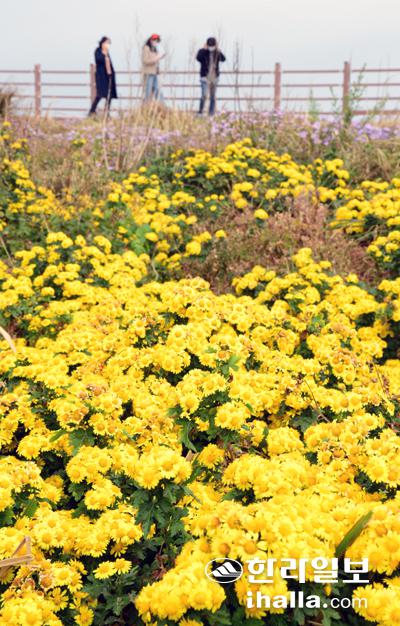 16일 제주시 구좌읍 종달리 해안 일대에 노란 들국화가 만개해 관광객들에게 익어가는 제주의 가을향기를 한껏 전해주고 있다. 강희만기자