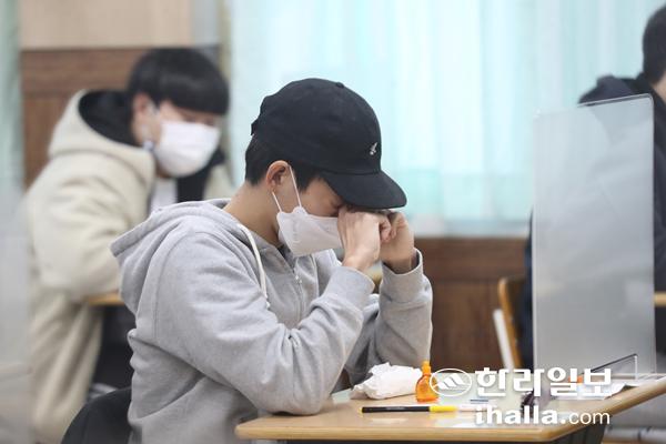 ![]() 3일 수능이 치러지는 제주제일고에서 아버지와 수험생 아들이 인사를 나누고 있다. 이상국기자 2021학년도 대학수학능력시험(이하 수능)이 3일 제주도내 17개 시험장에서 일제히 시행됐다. 1994년 수능 도입 이후 12월에 시험이 치러진 것은 이번이 처음이다. 이날 오전 제주제일고등학교 주변에는 경찰과 자치경찰, 모범운전자회 등이 배치돼 수험생 안내와 교통정리를 진행하고 있었다. 코로나19 여파를 의식한 탓인지 삼엄한 경비를 벌이는 것처럼 엄중한 분위기였다. 여느 때와 같은 수능 응원전도 찾아 볼 수 없었다. 코로나19 확산 방지 차원에서 수능 당일 시험장 앞 단체 응원 등 일체 집합행위가 금지됐기 때문이다. 그럼에도 친구 혹은 선배를 응원하기 위해 몇몇 무리가 "화이팅"을 외치기도 했지만, 곧바로 제주도교육청 관계자가 찾아가 거리두기 준수를 당부했다. 수험생들도 먼 발치에서 가족들과 인사를 나눈 뒤 혼자 시험장으로 걸어왔으며, 차량을 이용한 수험생 역시 뒷자리에서 혼자 내리는 등 코로나19를 의식하는 느낌이 역력했다. ![]() 시험실 입실 전에 손소독을 하는 수험생. 이상국기자 친구를 응원하러 왔다는 A(20)씨는 "재수를 한 친구를 격려하기 위해 시험장 앞을 찾았다. 재수인데도 오전 7시30분까지 푹 잤다고 하니 마음이 놓인다"며 "작년 수능을 봤을 때 후배들의 응원으로 북적였는데, 올해는 정반대의 분위기여서 생소하다"고 말했다. 먼 발치에서 수험생 아들은 보낸 강언식(53)씨는 "멀리서 아들의 걸어가는 뒷 모습을 보자니 짠하다"면서 "올해는 코로나19로 힘들었을 텐데 부디 좋은 성적이 나와 아들이 기뻐하는 얼굴을 보고싶다"고 소망했다. 한편 올해 제주에서는 시험장 17곳(일반 14곳·별도 2곳·병원 1곳)에서 총 6554명의 수험생이 수능에 응시하며, 감독·방역 인력은 1820명이 투입된다. ![]() 시험장으로 들어가는 수험생들. 이상국기자 ![]() 3일 수능이 치러지는 제주제일고에서 한 수험생이 시험지를 기다리고 있다. 이상국기자 <저작권자 © 한라일보 (http://www.ihalla.com) 무단전재 및 수집·재배포 금지 > |