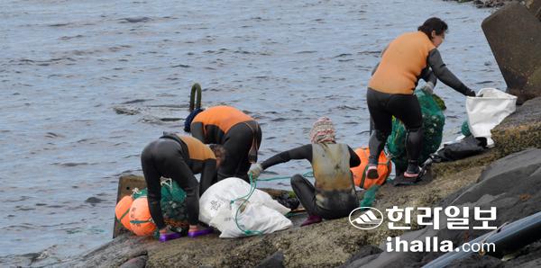7일 제주시 한경면 두모리 해안가에서 해녀들이 물질을 끝낸뒤 수확한 해산물 분류작업을 하고 있다. 강희만기자