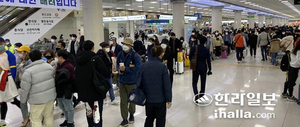 ![]() 설 연휴 마지막 날인 14일 오전 제주국제공항 2층 국내선 출발 대합실은 관광객 귀경객들로 북적였다. 이태윤기자 "내년에는 온 가족 모두가 함께할 수 있는 설날이 되었으면 하네요." 설 연휴 마지막 날인 14일 오전 제주국제공항 2층 국내선 출발 대합실은 귀경객보다는 여행을 즐기고 다시 일상으로 복귀하려는 관광객들로 북적였다. 관광객들의 카트에는 골프 가방 등 여행 짐이 한가득 실어져 있었고, 이들은 탑승 수속을 하기 위해 길게 줄을 선채 대화를 최대한 자제했다. 특히 이날 공항 내에서는 코로나19 여파에 따른 사회적 거리두기 탓인지 예년처럼 부모, 친지 형제와 아쉬운 작별 인사를 나누고 돌아가는 귀경객의 모습은 거의 찾아볼 수 없었다. 다만, 공항 출도장 인근 도로에는 수십 대의 차량이 줄지어 주정차 돼 있었고, 귀경객들은 차량에서 내린 뒤 차량에 탑승해 있는 가족들과 창문 넘어 작별인사를 나누고 곧바로 비행기를 타기 위해 공항 안으로 향했다. 서울로 돌아가는 딸을 배웅하기 위해 공항을 찾은 이모(55)씨는 "코로나19 감염이 우려돼 공항 내부로는 들어가지 않고, 차량에서 짧은 인사를 나누고 다음 만남을 기약했다"면서 "하루빨리 코로나19 사태가 끝나 모든 일상생활이 정상화됐으면 좋겠다"고 말했다. 고향을 찾았다가 다시 귀경길에 오른 강모(29)씨는 "집안 사정으로 코로나19 여파 속에서도 불가피하게 고향을 방문했지만 연휴 기간동안 친인척, 고향 친구 등을 만나지 못해 아쉬움이 크다"며 "내년에는 온 가족이 모일 수 있는 설날이 됐으면 하는 바람"이라며 아쉬움을 전했다. 이날 제주공항에는 입도 행렬도 이어졌다. 공항 도착장 게이트를 통해서는 골프백을 카트에 실은 관광객과 1~4명 단위로 구성된 관광객 등이 밀물처럼 쏟아져 나왔다. 공항 주차장에 마련된 렌터카 셔틀버스 정류소에도 20~30명의 관광객이 긴 줄을 늘어 선 채 셔틀버스를 기다리고 있었다. 제주도관광협회에 따르면 이번 설 연휴 기간(10~14일) 제주 방문객은 15만 명을 웃돌 것으로 예상된다. 설 연휴를 하루 앞둔 지난 10일 3만1489명, 11일에는 3만6326명, 12일 2만8136명, 13일 2만5135명이 제주를 찾은 것으로 잠정 집계됐다. 14일에도 약 3만여 명이 제주를 방문할 것으로 예상되는 등 설날 전후 닷새간 하루 평균 3만여 명이 제주에서 명절을 보내거나 관광에 나선것으로 나타났다. 한편 설 연휴 기간 서귀포시 안덕면 사계리 유채꽃밭 명소와 도내 주요 관광지에는 여행을 즐기려는 관광객과 가족 단위 나들이객들의 발길이 잇따랐다. 또 유명 음식점, 카페에는 관광객들이 긴 줄을 서서 기다리는 등 사회적 거리두기가 잘 지켜지지 않아 코로나19 감염 우려를 낳았으나, 14일 기준 설 연휴 동안 도내 코로나19 확진자는 발생하지 않았다. 도 방역당국은 설 연휴 이후 확산세가 나타날 가능성을 예의주시하고 있다. 제주도 관계자는 "코로나19 잠복기를 고려해 설 연휴 이후 일주일이 제주 방역의 최대 고비가 될 것으로 보인다"면서 "코로나19 상황을 예의주시하면서 도내 관광업계 종사자 등을 대상으로 코로나19 유증상 시 즉시 검사를 받을 수 있도록 적극 유도할 계획"이라고 말했다. <저작권자 © 한라일보 (http://www.ihalla.com) 무단전재 및 수집·재배포 금지 > |