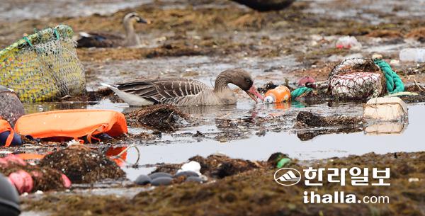 16일 제주시 애월읍 해안가에서 우리나라에서는 '길잃은새'로 알려진 회색기러기 한마리가 바다에 둥둥 떠있는 쓰레기 더미 속에서 먹이를 찾고 있다. 강희만기자