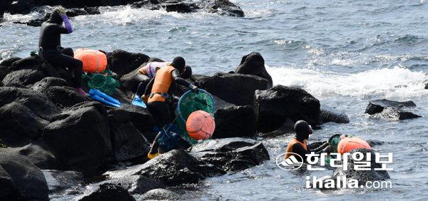 3일 서귀포시 대정읍 일과리 해안에서 해녀들이 일터인 바다로 나가고 있다. 강희만기자
