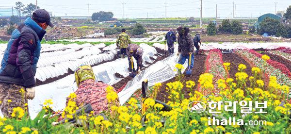 6일 서귀포시 대정읍 한 브로콜리 밭에서 농민들이 하우스 비닐 씌우기 작업을 하고 있다. 이상국기자