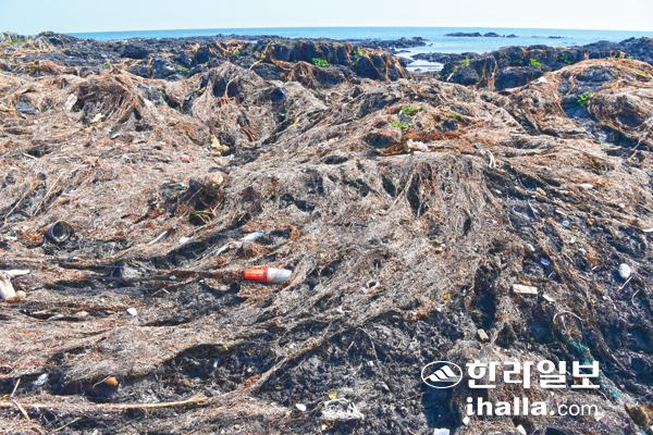 25일 제주시 구좌읍 평대리 해안에 끝없이 밀려오는 해양쓰레기와 괭생이모자반이 주변 청정환경을 해치면서 눈살을 찌푸리게 하고 있다. 강희만기자