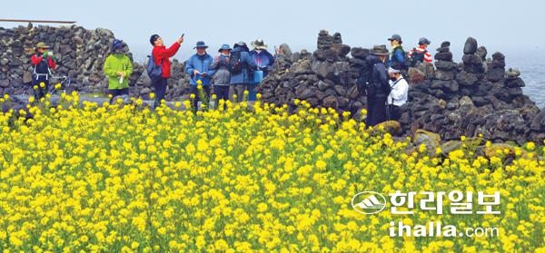 제주 전지역에 초미세먼지 경보가 내려진 29일 제주시 구좌읍 하도리 해안을 찾은 올레꾼들이 바다와 유채꽃을 배경으로 기념사진을 찍고 있다. 강희만기자