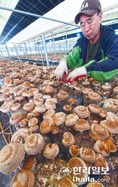 14일 서귀포시 하원동 한 농가 비닐하우스에서 참나무 톱밥을 이용해 재배한 표고버섯을 수확하고 있다. 강희만기자