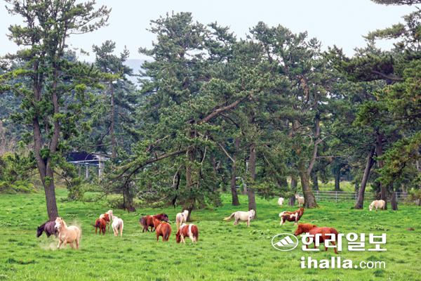15일 제주시 용강동 마방목지에 방목된 천연기념물 제347호인 제주마들이 한가로이 풀을 뜯거나 질주하며 자유를 만끽하고 있다. 이상국기자