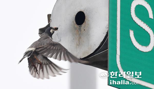 20일 제주시 한경면 용수리 인근 도로 이정표 구멍에 둥지를 튼 찌르레기가 먹이를 물고 새끼들이 있는 구멍으로 들어가고 있다. 강희만기자