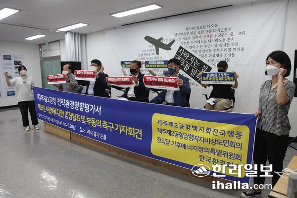 ![]() 제주 제2공항 강행저지 비상도민회의와 성산읍 반대 대책위원회 등은 30일 서울 중구 레이철카슨홀에서 기자회견을 열고 "환경부는 제주 환경수용성 넘어선 제2공항 사업을 부동의해야 한다"고 촉구했다. 사진=제2공항백지화전국행동 제공 제주 제2공항 강행저지 비상도민회의와 성산읍 반대 대책위원회 등은 30일 서울 중구 레이철카슨홀에서 기자회견을 열고 "환경부는 제주 환경수용성 넘어선 제2공항 사업을 부동의해야 한다"고 촉구했다. 이번 기자회견은 지난 11일 국토부가 1300페이지 분량의 제2공항 전략환경영향평가 재보완서를 환경부에 제출함에 따라 이뤄진 것이다. 이들은 "현재 확인되 재보완서 요약보에는 입지가 적정한지, 사업계획이 타당한지에 대한 가장 중요한 내용이 빠졌다"며 "또 재보완서의 현장조사와 법정 보호종 동식물 조사 등도 미흡하다"고 지적했다. 이어 "사회적 합의에 따라 이미 제주도민은 제2공항 사업 반대라는 결론을 냈다"며 "국토부가 전략환경영향평가 절차를 진행하는 것은 정부와 지역 주민간 합의, 민주주의를 무시한 처사"라고 덧붙였다. <저작권자 © 한라일보 (http://www.ihalla.com) 무단전재 및 수집·재배포 금지 > |