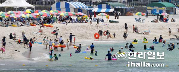17일 제주시 애월읍 곽지해수욕장에는 많은 피서객들이 찾아 물놀이를 하며 무더위를 식히고 있다. 강희만기자