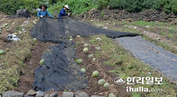 20일 제주시 애월읍 구엄리 수확을 마친 수박밭에서 농민들이 무더운 날씨 속에 다음 농사를 위해 폐비닐과 차광막을 수거하고 있다. 강희만기자