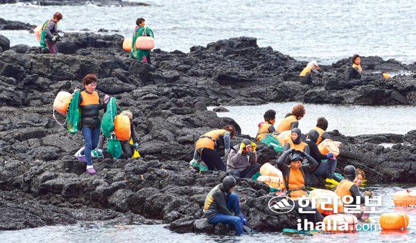 5일 제주시 한림읍 금능리 해안에서 물질에 나선 해녀들이 바다로 들어갈 준비를 하고 있다. 강희만기자