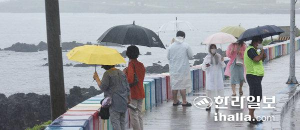 12일 비가 내리는 궂은 날씨 속에서도 제주시 도두동 무지개 해안도로를 찾은 관광객들이 제주 바다를 감상하고 있다. 이상국기자