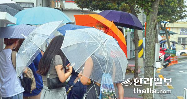 24일 계속되는 비날씨 속에 제주시 한림읍의 한 음식점을 찾은 도민과 관광객들이 우산을 쓴 채 가게 앞에서 자신들의 차례를 기다리고 있다. 강희만기자