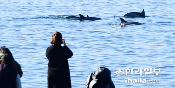 28일 서귀포시 대정읍 해안에서 관광객이 남방큰돌고래를 카메라에 담고있다. 강희만기자