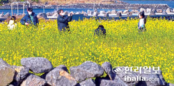 6일 서귀포시 성산읍 유채밭을 찾은 많은 관광객들이 사진을 찍으며 제주의 겨울정취를 만끽하고 있다. 강희만기자