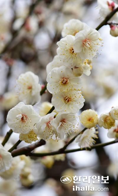 겨울비가 내린 23일 제주시 노형동 한 가정집 정원에 식재된 매화가 꽃망울을 터트렸다. 겨울비를 머금은 꽃망울이 더없이 소담스럽다. 강희만기자