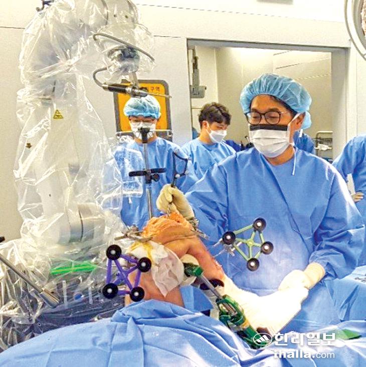 ![]() 로봇 수술 시스템을 이용한 무릎인공관절 전치환술. 비수술적 치료 효과 없으면 수술 ‘3D 프린팅’ 도입해 오차 최소화 절삭 기능 수술 로봇 도입 예정 ![]() 제주대학교병원 정형외과 최성욱 교수 '퇴행성 관절염'은 오랜 시간에 걸쳐 관절연골이 점차 마모되면서 관절 내 염증과 심한 통증을 일으키고 연골 및 뼈가 비정상적으로 딱딱해지고 골극이 형성되는 현상이 나타나며, 관절 움직임에 따른 마찰을 완충해주는 연골이 없어짐으로 인해 관절을 움직일 때 심한 통증과 운동장해가 나타나게 된다. 이번 제주인의 건강보고서에서는 최성욱 제주대학교병원 정형외과 교수의 도움을 얻어 퇴행성 관절염에 대해 알아본다. 퇴행성관절염의 대표적인 증상은 통증, 부종, 강직이며, 관절면의 조화로운 운동 기능이 소실되고 관절의 불안정성이 나타날 수 있다. 이러한 변화의 마지막 결과는 관절면의 손상이 일어나고, 이에 따르는 관절 기능이 점차적으로 소실되는 것이다. 퇴행성관절염의 진단을 위해 자세한 병력 청취, 신체 검진, 영상 검사까지 체계적인 진단 절차를 시행해야 한다. 영상학적 검사는 관절염의 진단에 필수적인 검사로 단순 방사선 검사(X-ray)에서 자기공명영상촬영(MRI)까지 종류가 매우 다양하다. 단순방사선 사진의 분류 방법들은 많이 소개돼 있으나 대표적으로 퇴행성 관절염에 사용하는 켈그렌-로렌스(Kellgren-Lawrence) 분류는 관절 간격과 골 경화, 골극의 형태를 보아 4단계로 분류를 하며, 마지막 단계인 4단계에서는 수술적 치료를 고려할 수 있다. ![]() 켈그렌-로렌스(Kellgren-Lawrence) 관절염 등급 분류. 수술적 치료는 비수술적 치료를 6개월 이상 충분히 했음에도 불구하고 일상생활에 지장이 있을 정도의 통증 또는 운동장해가 지속되는 경우 고려할 수 있다. 대부분의 말기 퇴행성관절염 환자들에게 통상적으로 좋은 예후를 보여왔던 수술적 치료법인 인공무릎관절 전치환술은 최근 의료기기 기술과 재료의 눈부신 발전에 따라 크게 향상된 임상적 결과와 환자 만족도를 보이고 있다. 인공무릎관절 전치환술은 1960년대에 영국의 존 찬리(John Charnley)경에 의해서 처음 시행된 이후 30년간은 대퇴골과 경골 사이 삽입되는 플라스틱의 마모 문제로 인해 60세 이상 환자에게만 제한적으로 시술돼 왔다. ![]() 인공무릎관절 전치환술 전과 후 하지의 정렬 X-Ray. 인공관절 전치환술은 병변이 있는 기존의 관절면을 제거하고 그 위치에 인공관절을 치환해 관절이 통증 없이 부드럽게 움직이도록 복원해주는 수술이다. 기존의 관절 기능을 완벽하게 복원하기 위해서는 하지의 정렬을 맞추는 것이 중요하며 수술 전 계획이 정확히 수행돼야 성공적인 수술 결과를 얻을 수 있다. 하지만 환자마다 해부학적 구조가 다르며 수술 역시 각자 다른 의료진에 따라 집도되다 보니 그 정밀함에 있어 한계가 있고, 불가피한 오차로 인한 수술 결과의 차이가 날 수 있는 것이 현실이다. 이를 보완하기 위해 제주대학교병원에서는 현재 3D 프린팅 기술을 이용한 환자맞춤형 인공무릎관절 전치환술(Total Knee Arthroplasty using Patient-Specific Instrument, PSI-TKA)을 도입해 환자들의 수술을 하고 있다. 환자맞춤형 인공무릎관절 전치환술은 퇴행성관절염 환자 개개인의 무릎 컴퓨터단층촬영(Computer Tomography, CT) 영상을 3차원으로 복원, 생체역학적 분석을 통해 최소의 골 절제와 최적의 치환물 삽입이 가능하게 하는 수술 기법이다. 해당 수술법은 기존의 고식적인 인공무릎관절 전치환술과 달리 3D 프린터를 이용한 환자맞춤형 수술기구(Patient-Specific Instrument, PSI)를 사용해 수술 오차범위를 최소화하며 수술의 정확도가 높다. 더불어 기존의 고식적인 수술법에 비해 환자가 부담하는 비용에 차이가 거의 없으며, 특히 과거 골절 수술 병력이나 외상으로 인한 변형이 있어 기존의 고식적인 수술법을 적용하기 어려운 환자들에게도 사용될 수 있다는 장점이 있다. 더 나아가 불필요한 수술 과정을 생략하고 수술 시간을 단축시키므로 그에 따른 합병증 발생률도 낮출 수 있을 것으로 기대되고 있다. 이러한 환자맞춤형 인공무릎관절 전치환술은 환자마다 최적의 수술 계획을 가능하게 하지만 결국은 수술은 의료진이 집도하다 보니 여전히 미세한 오차가 발생할 여지가 남아있게 된다. 따라서 제주대학교병원에서는 완전 자동절삭 기능을 갖춘 인공무릎관절 수술 로봇을 도입할 계획을 가지고 있다. 일반적으로 로봇 수술이라고 하면 로봇이 의료진을 대신해 수술의 전과정을 진행한다고 생각하는 사람들이 많다. 하지만 실제로는 로봇 인공무릎관절 전치환술은 로봇의 도움을 받아 의료진이 직접 수술을 집도하는 것이다. 의료진이 로봇팔을 제어하며 수술을 진행하기 때문에 수술 중 의료진의 임상적 판단에 따라 수술 계획을 수정할 수 있다. 로봇의 높은 정밀성과 정확도로 수술 전 산출된 수치를 통해 1㎜의 오차도 없이 정밀하게 뼈를 절삭한 후 인공무릎관절을 정확한 위치에 삽입하기 때문에 의료진의 오차를 최소화하고 환자에 최적화된 수술을 시행해 기존의 무릎과 동등한 인공무릎관절 기능을 복원할 수 있다. 더 나아가 수술 시간