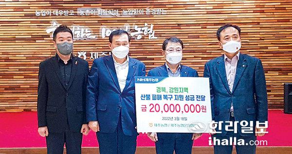 ![]() 농협제주지역본부(본부장 강승표)는 지난 18일 지역본부 회의실에서 강원·경북지역 산불 피해복구 지원 성금 기탁식을 가졌다. 이번 성금은 농협은행 제주영업본부와 제주농협운영협의회가 각각 1000만원씩 기탁해 조성된 것으로, 농협중앙회 계열사인 (사)도농상생운동본부를 통해 피해 지역에 전달될 예정이다. 제주도의회 산불피해 지역 성금 ![]() 성금은 제주도의원들이 십시 일반 모아 마련한 것으로 산불 피해 지역 주민들의 생계·주거 지원과 구호 물품 구매 비용 등으로 쓰일 예정이다. 사회복지법인 춘강 산불피해 지원금 ![]() 이번 성금은 춘강 임직원들이 강원·경북지역 산불피해 지원을 위해 마련한 것이다. 적십자사 나눔문화위 산불피해 지원금 ![]() 이번 성금은 나눔문화위원회 위원들이 십시일반 정성을 모아 마련됐다. 안덕면새마을부녀회 산불 피해 기금 ![]() 조천읍 주민자치위 산불 피해 성금 ![]() <저작권자 © 한라일보 (http://www.ihalla.com) 무단전재 및 수집·재배포 금지 > |
