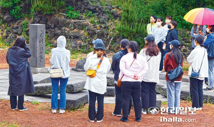 11일 제주시 조천읍 북촌리 너분숭이 4·3유적지를 찾은 탐방객들이 ‘순이삼촌’ 비석 앞에서 4·3당시 참혹했던 마을 이야기를 듣고 있다. 강희만기자
