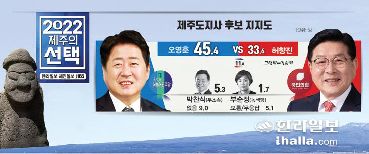 ![]() 왼쪽부터 오영훈 허향진 부순정 박찬식 제주지사 후보. 6·1지방선거를 일주일 앞두고 실시된 제주도지사 여론조사 결과 더불어민주당 오영훈 후보가 여전히 지지도, 당선가능성 모두 1위 자리를 지켰다. 다만 이달초 실시된 6·1지방선거 언론3사 공동 제주도 2차 여론조사 보다 오 후보와 국민의힘 허향진 후보의 격차는 소폭 줄어든 것으로 나타났다. 한라일보·제민일보·JIBS제주방송 등 제주지역 언론 3사는 국내 여론조사 전문기관인 (주)리얼미터에 의뢰해 지난 22일부터 24일까지 3일 동안 제8회 전국동시지방선거 도지사 및 교육감 후보 적합도와 제주시을 국회의원 보궐선거 후보 적합도 등을 묻는 제3차 여론조사를 진행했다. ![]() 특히 이달초 실시된 6·1지방선거 언론3사 공동 제주도 2차 여론조사 당시 제주도지사 후보 적합도 조사에서 오영훈 후보가 47.9%로 30.1%를 얻은 국민의힘 허향진 후보를 17.8%p 앞선 바 있지만, 적합도 조사와 성향이 비슷한 이번 지지도 조사에서는 양 후보간 격차는 11.8%p로 좁혀진 것으로 나타났다. 지역별로 살펴보면 오영훈 후보가 제주도 전 지역에서 우위를 점했다. 오영훈 후보는 제주시 45.7%, 서귀포시 44.5%를 차지해 각각 33.0%, 35.1%를 기록한 허향진 후보를 앞섰다. 또 제주시 갑선거구1·2에서는 오 후보가 각각 41.5%, 42.3%를 얻었고 허향진 후보는 34.5%, 34.6%를 기록했다. 특히 오 후보는 국회의원 시절 지역구였던 제주시 을선거구1·2에서 48.9%, 51.3%를 얻어 전체 결과 대비 높은 지지도를 받았고, 허 후보는 32.4%, 30.0%에 그쳤다. 서귀포시 동지역은 오 후보가 45.3%, 허 후보가 35.3%를 기록했고, 서귀포시 읍·면지역은 오 후보 43.5%, 34.8%를 얻었다. 세대별로 보면 오 후보가 60세 이상을 제외한 모든 연령대에서 앞섰다. 특히 40대 연령층에서 61.1%의 지지를 얻어 크게 앞섰으며, 50대 46.5%, 18~29세 44.0%, 30대 43.9%, 60세 이상 35.3% 순으로 나타났다. 반면 허 후보는 60세 이상 연령층에서 50.3%의 지지율을 기록해 오 후보(35.3%)를 앞섰고, 이어 50대 35.8%, 30대 30.4%, 40대 21.7%, 18~29세 19.0% 순으로 집계됐다, 성별 지지도 조사의 경우 남성 지지도에서 오영훈 후보는 44.1%, 허향진 후보는 36.7%의 지지율을 보였고 여성 지지도에서는 오영훈 후보가 46.6%, 허향진 후보가 30.6%를 나타내며 남여 응답자 모두 오영훈 후보의 지지도가 높았다. 이념 성향별 조사에서는 오영훈 후보가 진보에서 67.0%, 허향진 후보는 보수에서 63.8%의 지지율을 나타냈고, 중도에서는 오영훈 후보가 48.5%를 기록해 31.2%를 기록한 허 후보에 앞섰다. 직업별로는 ▷농·임·축산·어업=오영훈 후보 44.9%, 허양진 후보 38.1% ▷사무·관리·전문직=오영훈 후보 56.9%, 허양진 후보 21.9% ▷판매·생산·노무·서비스직=오영훈 후보 43.7%, 허향진 후보 30.0% ▷자영업=오영훈 후보 45.4%, 허양진 후보 40.2% 등 대체로 오영훈 후보가 우세했지만, 가정주부에서는 허향진 후보가 48.3%를 기록해 32.6%를 기록한 오영훈 후보를 앞섰다. ![]() 지지 여부와 상관없이 차기 제주도지사로 당선 가능성이 가장 높은 인물은 누구라고 생각하는지에 대해 묻는 도지사 후보 당선 가능성에서는 오영훈 후보와 허향진 후보의 격차가 더 크게 벌어졌다. 오 후보의 당선 가능성은 57.5%로 나타나 허 후보(24.9%)보다 32%p 이상 앞섰다. 다음으로는 무소속 박찬식 3.3%, 녹생당 부순정 1.7% 순이었다. 또 없음과 모름·무응답은 각각 5.0%, 7.5%를 나타냈다. 세대별 조사에서는 오영훈 후보가 전 연령대에서 상대 후보들을 오차 범위 밖에서 따돌렸다. 지지도와 마찬가지로 오 후보의 지지율은 40대 연령층에서 70.0%를 얻어 상대 후보들과 비교해 압도적으로 높았으며, 30대 62.7%, 50대 59.1%, 18~29세 52.2% 순으로 나타났다. 특히 오영훈 후보는 60세 이상 연령 층에서도 48.2%를 얻어 같은 연령대에서 33.4%를 차지한 허양진 후보를 앞섰다. 지역별 조사에서도 오영훈 후보는 상대적으로 높은 지지를 받았다. 구체적으로 제주시 58.9%, 서귀포시 53.9%를 보이면서 각각 24.5%와 26.0%를 보인 허향진 후보를 앞질렀다. 이념 성향별 조사에선 진보 성향의 경우 오영훈 후보가 74.9%를 얻어 11.4%인 허 후보를 크게 앞섰으며, 보수 성향에서는 허향진 후보가 46.0%로 38.9%를 나타낸 오영훈 후보를 앞질렀다. ![]() 제주도지사 선서에서 후보를 선택할 때 가장 중요하게 고려하는 것으로 후보 능력과 경험이 26.0%, 정책 및 공약 23.8%, 소속 정당 21.4%로 오차범위(±2.5%) 내 차이를 보이며 많은 응답을 받은 것으로 나타났다. 다음으로는 도덕성과 청렴성 14.2%, 전문성 7.6%로 순으로 나타났다. 기타는 4.1%, 모름·무응답은 2.8%로 나타났다. 후보 능력과 경험은 서귀포시 읍·면지역(31.5%), 제주시 을선거구2(30.7%), 50대(30.0%), 진보층(29.2%), 중도층(28.8%), 판매·생산·노무·서비스직(30.1%), 사무·관리·전문직(28.8%), 더불어민주당 지지층(32.4%)에서 전체 결과 대비 높은 응답률을 보였다. 또 정책 및 공약은 만18~29세(29.1%), 30대(27.3%), 40대(26.7%), 사무·관리·전문직(28.2%), 정의당 지지층(34.7%)에서 응답률이 높았다. 소속 정당은 제주시 갑선거구2(27.7%), 보수층(28.4%), 무직·은퇴·기타(24.8%), 국민의힘 지지층(29.2%), 정의당 지지층(24.0%)가 높은 전체 결과 대비