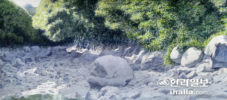 ![]() 영실기암까지 냇가를 따라 올라갈 수 있는 마을이다. 동서로 1㎞지만 남북으로는 15㎞가 넘는다. 한라산 정기가 냇가를 따라 흘러와 풍부한 식생을 형성시켰다. 정주공간과 인접한 도순천 양옆에 온대성 수목이라고 할 수 있는 녹나무 외에도 구실잣밤나무, 산유자나무, 상산나무 등 식생의 보고라 아니할 수 없다. 필자가 하천을 따라 올라가며 느낀 점은 간명하다. 도순천 자체가 거대한 식물원이라는 것. 그 중에서 마을 주민들의 자부심은 천연기념물 제162호 녹나무 자생지다. 제주특별자치도 도목이기도 한 녹나무에 대해 마을 어르신들은 그 가치를 이렇게 표현한다. '살아서 천년 죽어서 천년' 사는 것이 녹나무의 신비라는 것이다. 4·3 이전까지만 해도 하천변에 몇 아름 되는 크기의 녹나무들이 빼곡하게 자라고 있었다고 한다. 지금 녹나무는 그 당시 강제로 잘라버린 녹나무들에 비하면 묘목 수준이라는 것이다. 한마디로 거대한 원시림 지역이었다는 뜻. 원나라가 탐라를 고려에서 분리해 직접 탐라총관부를 설치, 지배하던 시기에 녹나무를 가져갔다는 기록이 그런 크기의 나무였을 것이라는 생각에 안타까움을 더하게 한다. 견고하며 좀이 슬지 않는 특성에다 다양한 약리작용까지 있다고 하니 원 제국이 탐 낼만도 했을 것이다. 도순목장 위쪽 쌍계암에 모셔진 녹나무 불상은 나뭇결을 그대로 살렸는데 결의 흐름이 주는 신비감에 저절로 경탄이 일어난다. 세월이 흘러도 쪼개짐이 없으니 목불을 조성하는데 쓰일 수 있었다는 녹나무의 진가를 발견한다, 고작 명의 제후국 조선이 건국되고 태종16년 이 섬에 3현이 설치되면서 대정현에 속한 석송리라는 마을. 이미 마을이 존재했다는 증거다. 없는 마을에 이름을 붙일 일은 없었을 터. 족보와 같은 자료에 근거하면 1402년 경 이씨, 서씨 등에 의해 마을이 형성된 것으로 돼있다. 지금의 도순리는 일제강점기에 등장한 마을 명칭이라고 한다. 인근 마을 어르신들이 '돌생이'라는 이름으로 도순리를 부르는 것에 대한 연원을 파악했더니 1896년 군제가 실시되던 당시에 돌송리(일명 독송리)라고 불렀던 과거가 있어, 거기에서 왔다는 것이다. 도순마을이 보유한 엄청난 경관 자원은 마을목장이다. 옆에 풍부한 자연림 하천이 목장과 함께 있어서 하나의 벨트로 연결 지어진다면 부가가치는 상상을 초월할 것이다. 뷰포인트라고 할 수 있는 전망 공간이 수두룩하다. 목장 내에 옛 목축문화를 가늠 할 수 있는 곳들도 있어서 이색적인 면모를 갖추고 있다. 해발고도를 따라 느껴지는 요소들은 어떤 관점에서 접근하느냐에 따라 놀라운 방법들이 등장할 개연성이 크다. 경관 자원으로써 큰 가치를 지닌 녹차밭 풍경은 한라산을 배경으로 시각적 힐링을 주는 매력이 있다. 우연의 일치겠지만 두 개의 초록이 대표단수가 된 느낌이다. 도순리에서 만난 녹차와 녹나무. 사시사철 초록을 보유할 수 있다는 것은 엄청난 경쟁력이다. 정주공간과 한라산 사이에 엄연하게 존재하는 마을 자산을 가지고 미래지향적으로 활용할 수 있다면 도순마을의 앞날은 밝다. 이상준 마을 회장에게 도순마을 주민들의 의식세계를 관통하는 가장 큰 공감대가 무엇인지 여쭸다. 대답은 명료하게 '한울타리'라고 했다. 순간 스치고 지나가는 사실이 있다. 제주 최초의 새마을금고 발상지라는 자긍심이 이러한 전통적 공동체의식에서 왔다는 그 것. 한 울타리 안에 산다는 것은 가족을 의미한다. 가족은 천륜이라서 끊고 싶어도 끊을 수 없는 숙명. 하염없이 서로를 이해하고 위하는 마음으로 이뤄진 그런 관계를 마을 주민들의 삶의 목표로 삼고 있다는 의미로 파악된다. 마을주민들이 상부상조 정신에 입각해 금융을 운영한다는 것이 새마을운동 초창기 보편적 의식 수준으로써는 도전하기 힘든 과제였을 것이다. 도순리는 해냈다. 마을 주민 그 누구도 나에게 손해를 끼칠 사람이 없다는 확신. 이 것이 한 울타리에 담긴 진정한 뜻이라고 밝혔다. 도순마을의 힘은 그러한 신뢰에서 나온다. 마을발전의 무한 동력으로 결코 모자람이 없다. 도순마을이 보유한 방대한 자원들의 가치보다 더 큰 자산이 있다면 당당하게 한울타리정신이라고 눈빛으로 이야기 하는 듯하다. 다양한 가능성이 기다리는 마을. 끊임없이 분투하고 활로를 찾아 여기까지 왔다면 다가오는 미래는 더욱 새롭고 활기찰 것이다. <시각예술가> 마을 안길 정겨운 풍경 <수채화 79cm×35cm> ![]() 한 세대 이상을 그 자리에서 자란 전봇대보다 큰 삼나무가 발생시키는 그늘은 실로 놀라운 빛과 그늘의 하모니를 만들어냈다. 밑동 굵기가 전봇대와 대충 같아 보인다. 세대와 세대가 공존하는 지금의 현실을 여름날 뙤약볕 아래서 화면에 담을 수 있기에 그렸다. 골목이라기엔 크고, 대로변이라고 할 수는 없는 지극히 제주적인 마을길이다. 굽이 돌아가는 공간적 상황이 지붕들의 다양한 배치를 가능하게 한다. 멀리 남쪽 바닷가에 형성된 두꺼운 흰 구름이 잔뜩 물기를 머금어 여기로 달려오면 시원한 소나기를 선물할 것 같다. 지붕의 색들이 나름대로 멋을 부리며 조화를 이루는 안온한 싱그러움으로 다가오는 것은 높지 않은 그 무엇