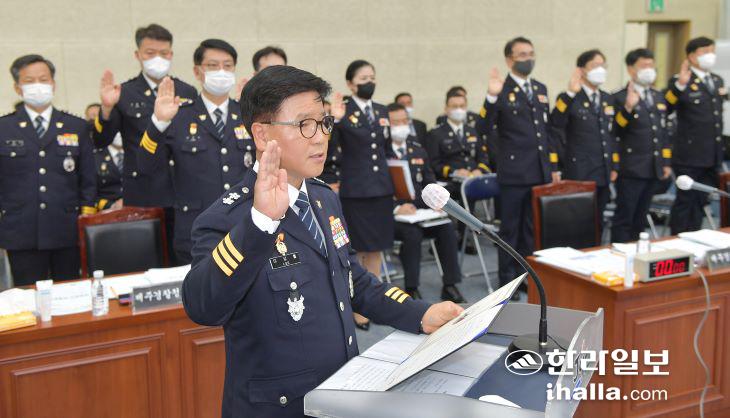 ![]() 21일 제주도청에서 열린 국회 행정안전위원회 제주경찰청 국정감사에서 이상률 제주경찰청장과 경찰관들이 증인 선서를 하고 있다. 이상국기자 [한라일보] 제주경찰청에 대한 국정감사에서 제주지역 마약과 무단이탈 외국인 문제 등에 대한 대응 강화 주문과 함께 제주 경찰 시책에 대한 호평이 이어졌다. 국회 행정안전위원회(위원장 이채익)는 21일 제주특별자치도청 탐라홀에서 제주경찰청에 대한 국정감사를 실시했다. 이날 국정감사에서는 이상률 제주경찰청장과 강언식 차장 등 14명의 제주경찰청 관계자와 김용구 제주자치경찰위원회 위원장 등이 증인으로 참석했다. 행정안전위원회 의원들은 제주지역 무단이탈 외국인 문제와 장비 관리 문제 등을 지적했다. 문진석(더불어민주당·충남 천안시 갑) 의원은 "제주로 입국한 외국인들이 무단이탈하는 일이 이어졌다"며 "무단 이탈자 브로커 단속 실적이 있느냐"고 질의했다. 이에 대해 이상률 제주경찰청장은 "현재까지 브로커 단속 실적은 없다"며 "무단이탈자에 대해서는 유관 기관인 제주 출입국·외국인청과 협력해 대응하고 있으며 무단 이탈자 브로커가 있다면 적극 검거해 제주 치안에 대한 우려를 종식시키겠다"고 답변했다. 정우택(국민의힘·충북 청주시 상당구) 의원은 "5년 동안 수갑 분실이 21건, 올해도 8건이나 발생했다"며 "수갑은 경찰 장비 관리 규칙에 따른 장구류인데 관리가 소홀한 것 아니냐"고 지적했다. 이에 이상률 제주경찰청장은 "수갑 분실 시에는 물품관리법에 따라 비용을 변상받고 있으며 분기별로 철저히 조사해 관리하겠다"고 답했다. ![]() 국회 행정안전위원회 제주경찰청 국정감사에서 이상률 제주경찰청장이 의원들의 질의에 답변하고 있다. 이상국기자 경찰 출신인 이만희(국민의힘·경북 영천시 청도군) 의원은 "청장님 요즘 인기 있는 드라마 수리남을 본 적이 있나? 최근 제주뿐만 아니라 전국적으로 마약 문제가 위험한 지경인데 제주도는 특히 전 연령에서 마약사범이 늘었는데 9명의 전담 수사 인력으로 대응이 가능하겠느냐"고 물었다. 정우택(국민의힘·충북 청주시 상당구) 의원 역시 "제주 마약 택배 괴담에 대해 들어 봤는가"라며 "제주가 마약 터미널이 되는 것 아닌 지 우려스럽다"고 말했다. 이상률 청장은 "제주 마약범죄에 대한 심각성을 인식하고 있으며 이른바 던지기 수법 등 신종 마약 거래와 관련해서도 전담 인력을 더 확충할 계획"이라며 "국정원과 관세청 등 유관기관과 협력하고 다크웹과 SNS 등에 대한 모니터링을 강화해 마약 범죄에 적극 대응하겠다"고 했다. 제주경찰청이 운영 중인 '국가유공자 운구차량 에스코트'와 여성 폭력 가해자에 대한 '교화 프로그램' 등에 대한 호평도 있었다. 이채익(국민의힘·울산 남구 갑) 위원장은 "제주 경찰의 국가유공자 운구차량 에스코트에 감동을 받았다. 전국적으로 확대할 필요성이 있다"고 말했다. 또 천준호(더불어민주당·서울 강북구 갑) 의원은 "제주도 스토킹 사건이 인구 대비 전국에서 3번째로 많은데 사건 처리율만 보면 전국 1위로 잘 대응하고 있는 것 같다"고 말했고 임호선(더불어민주당·충북 증평군 진천군 음성군) 의원은 "찾아가는 가해자 교화 프로그램 아주 좋다. 성과를 내야 하는 것이 숙제지만 상담사의 안전을 확보할 수 있도록 하고 법적 근거를 마련해 국비를 확보해도 좋을 것 같다"고 했다. <저작권자 © 한라일보 (http://www.ihalla.com) 무단전재 및 수집·재배포 금지 > |