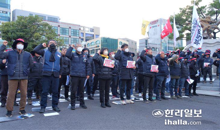 ![]() 민주노총 제주본부 조합원들이 6일 제주시청 앞에서 화물 총파업 투쟁 승리를 위한 제주지역 결의대회를 열고 있다. 김도영기자 [한라일보] 화물연대의 총파업 13일째를 맞아 제주지역에서 총파업·총력 투쟁 결의대회가 개최됐다. 민주노총 제주본부는 6일 제주시청 앞에서 화물 총파업 투쟁 승리를 위한 제주지역 결의대회를 열고 "화물노동자의 안전과 생존권 사수에 국가는 없었다"며 "화물노동자 파업 승리를 위해 힘차게 투쟁하자"고 말했다. 참가자들은 "안전운임제는 화물노동자와 국민의 생명을 지키기 위한 최소한의 안전장치로 화물 노동자들이 낮은 임금 때문에 상시적인 과로, 과적, 과속의 위험에 내몰리지 않도록 하는 최소한의 기준"이라며 "노동자들은 일몰제를 폐지하고 적용 대상 확대를 요구하고 있지만 정부는 형식적으로 협상 자리에 한 번 나오고 시간만 끌고 있다"고 주장했다. 이어 "윤석열 정부는 화물 기사의 자격을 박탈하고 다시는 운전대를 잡지 못하게 하겠다며 협박하고 있다"며 "업무개시 명령을 발동해 시멘트 부분 강제노동을 명령하고 정유·철강 분야에도 발동 준비를 지시하는 등 안전 운임제에 대한 사회적 논의와 진지한 협상 없이 노동자의 일방적인 굴복만 강요하고 있다"고 덧붙였다. 참가자들은 또 "안전 운임제 지속과 적용 대상 확대는 물러설 수 없는 우리의 요구"라며 "민주노총 제주본부 1만3000조합원은 화주 재벌과 부자들만을 위한 윤석열 정부에 맞서 국민의 안전과 노동자의 생존권을 지켜내고 불평등 세상을 바꾸기 위해 총력 투쟁할 것"이라고 강조했다. <저작권자 © 한라일보 (http://www.ihalla.com) 무단전재 및 수집·재배포 금지 > |