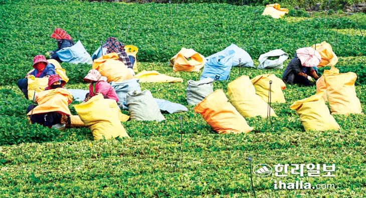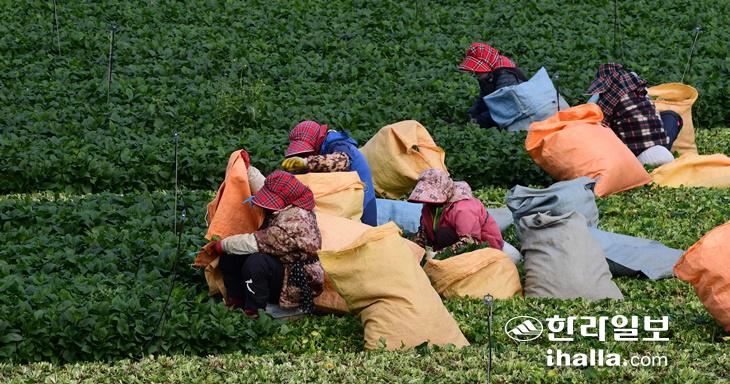 6일 초겨울 날씨 속에 제주시 애월읍 애월리 한 농경지에서 어르신들이 취나물 수확 작업을 하고 있다. 강희만기자