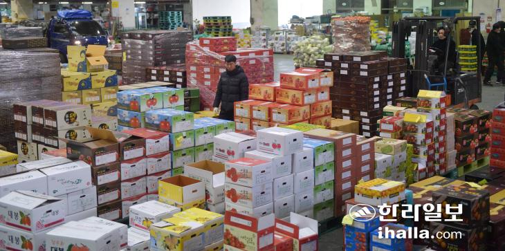 코앞으로 다가온 설15일 제주시 일도2동 제주시농협 농산물공판장에 설을 앞두고 많은 과일들이 쌓여있다. 이상국기자