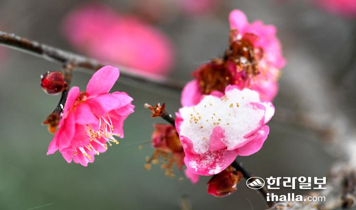 24일 제주시 노형동 한 가정집 마당에 핀 분홍 매화꽃에 새하얀 눈이 소복이 쌓여 한폭의 그림을 연상케 하고 있다. 강희만기자